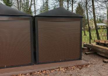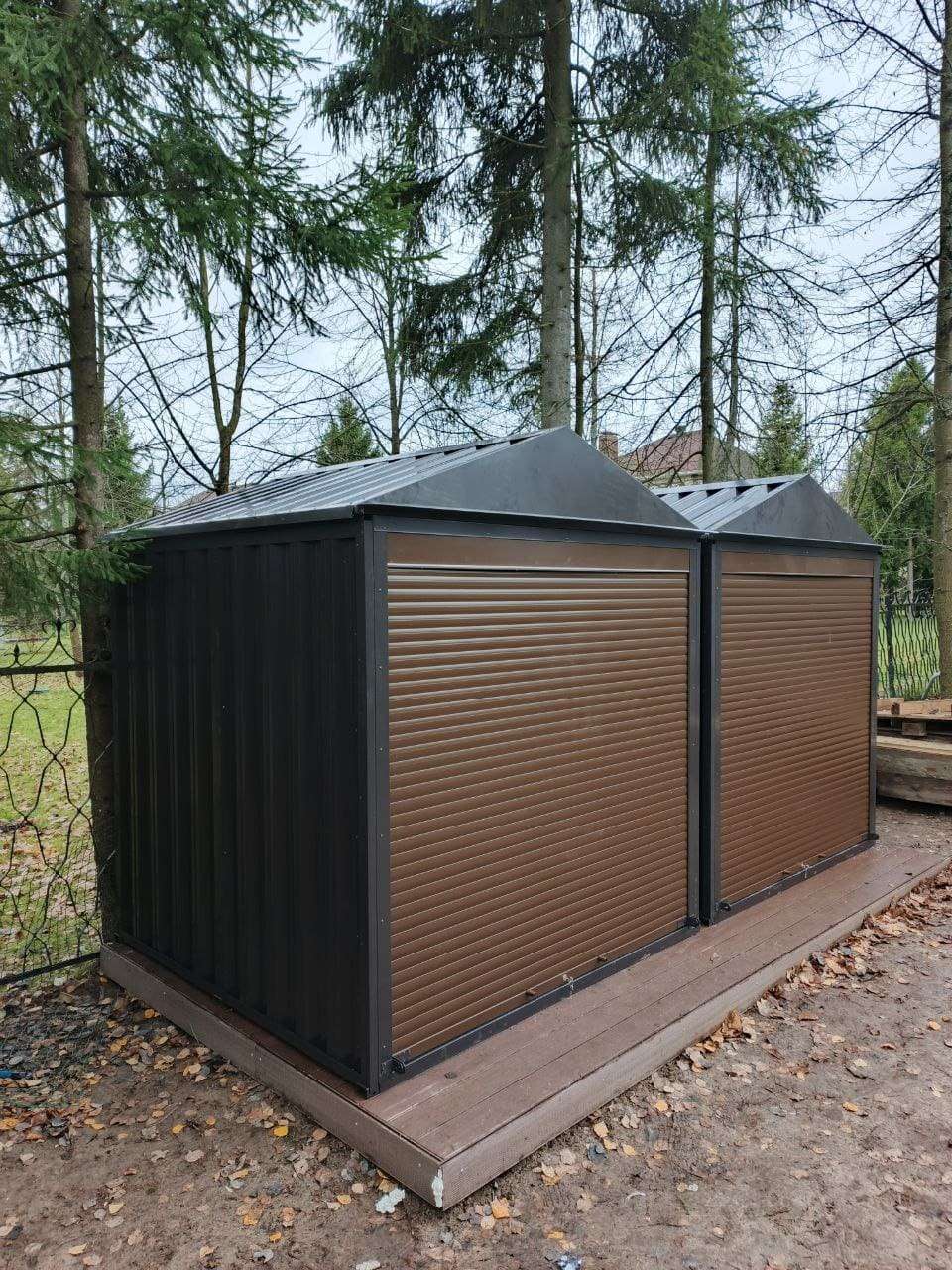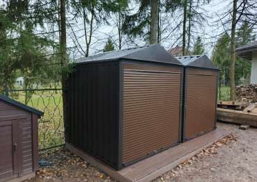 Нами были изготовлены две стандартные 2-метровые конструкции с двускатными крышами и торцевыми входными группами с рольставнями в благородном серо-коричневом цвете RAL 8019.