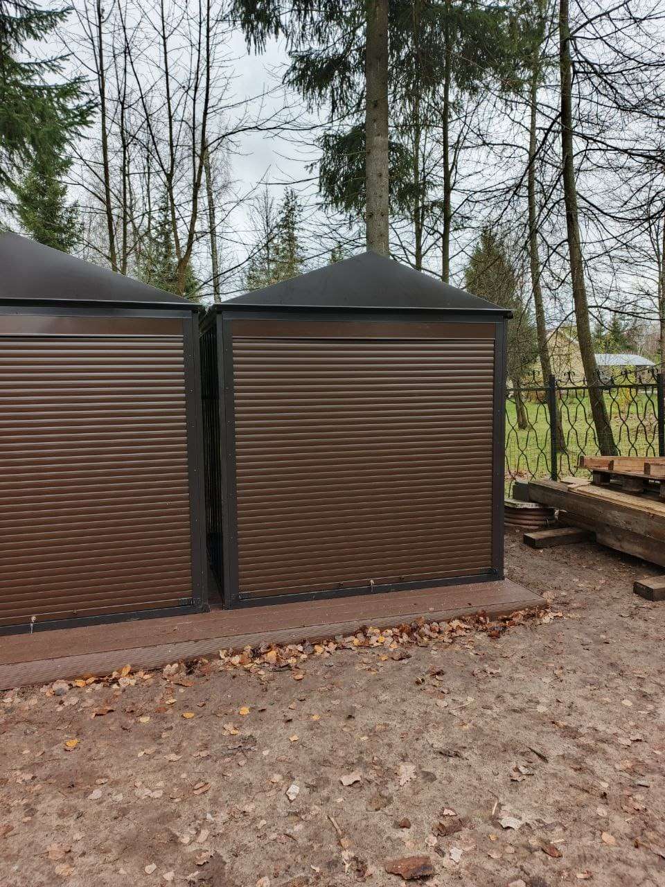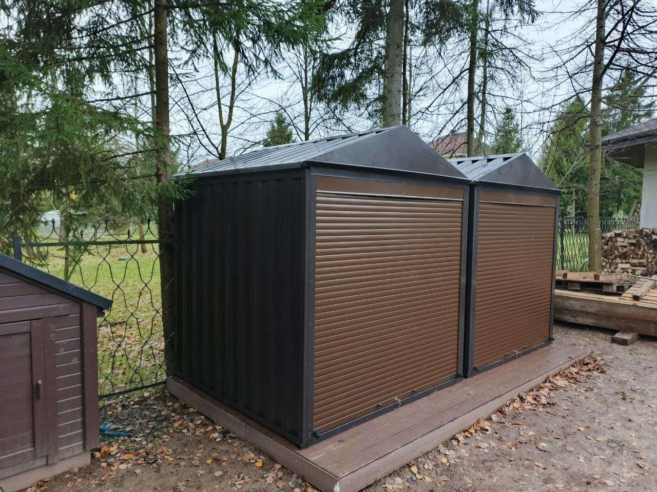 Проект: два 2-метровых хозблока для хранения садового инвентаря и хозяйственных вещей в серо-коричневом цвете.