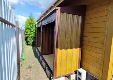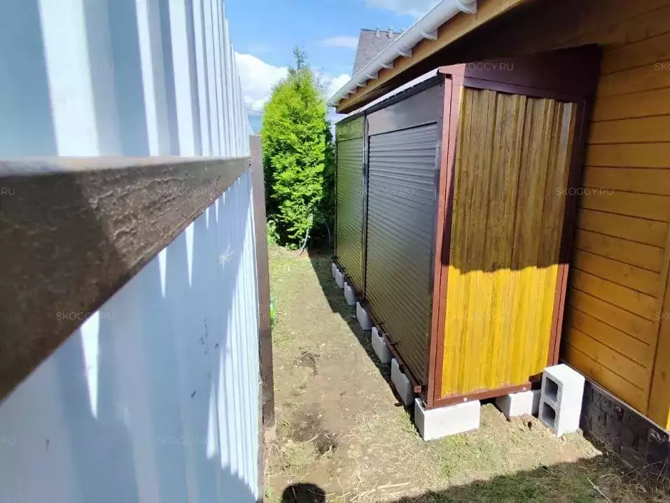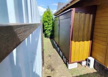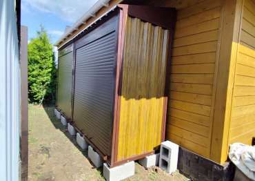 Нами были изготовлены две конструкции дровницы размерами 1,03 х 2,22 х 2,1 м, дополненные рольставнями, в необычном сочетании расцветок «под дерево» Дуб 3Д для основных элементов и шоколадно-коричневого RAL 8017 для фасонных элементов и рольставни. Такая расцветка была выбрана для того, чтобы постройка максимально сочеталась по цвету с жилым домом на участке.