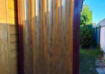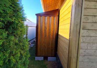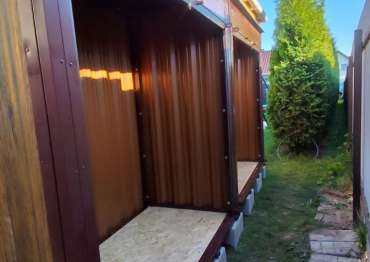 Нами были изготовлены две конструкции дровницы размером 2,16 х 1,03 х 2,35 м в расцветке «под дерево» Дуб 3Д с односкатной крышей и рольставнями, выполненными в шоколадно-коричневом цвете RAL 8017.