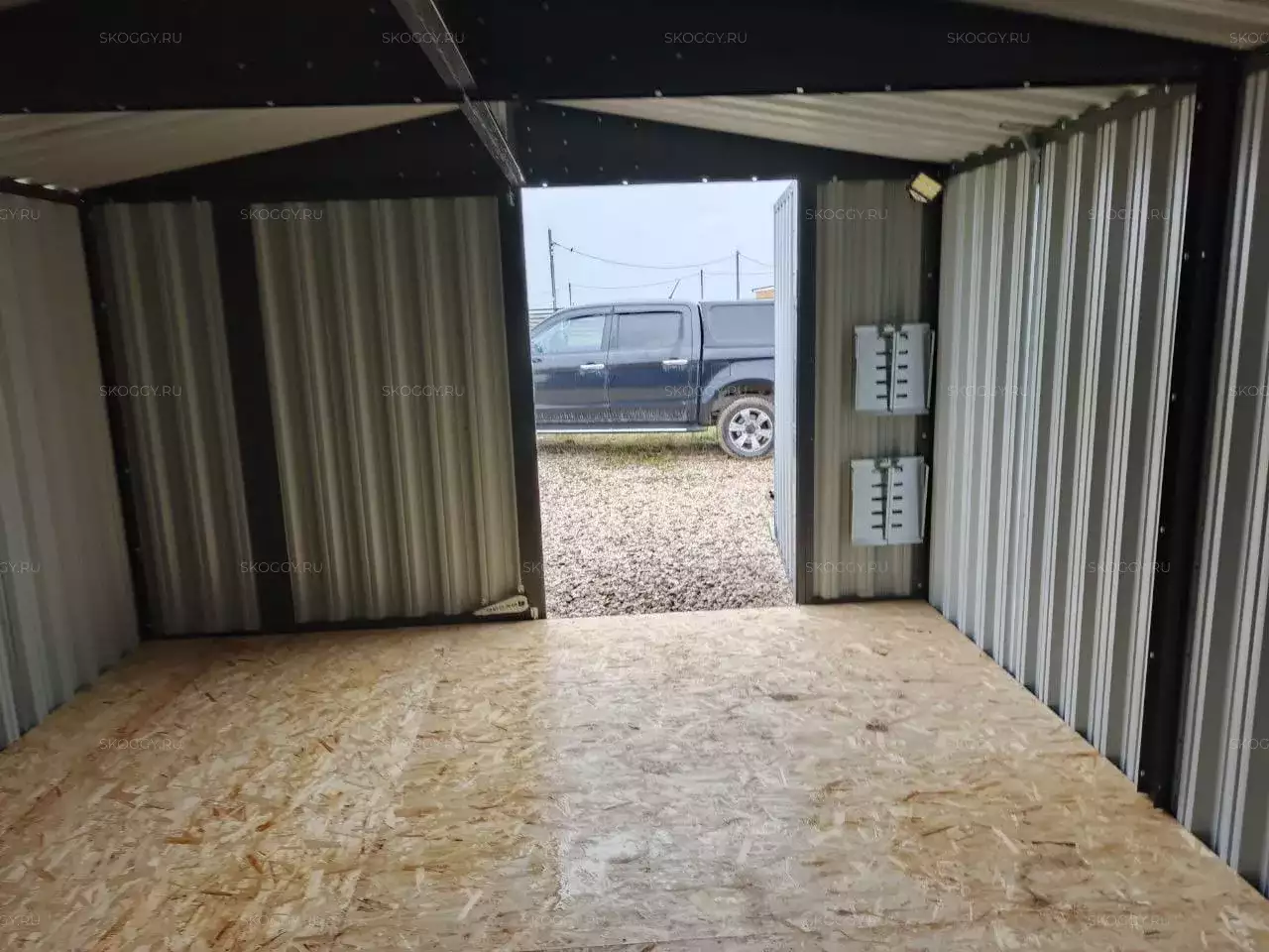 Дополнительно гараж укомплектовали двумя прямыми стеллажами с двумя полками, световым окном размером 90 х 30 см, пандусами, упорами для распашных ворот, а также системой освещения на солнечной батарее.