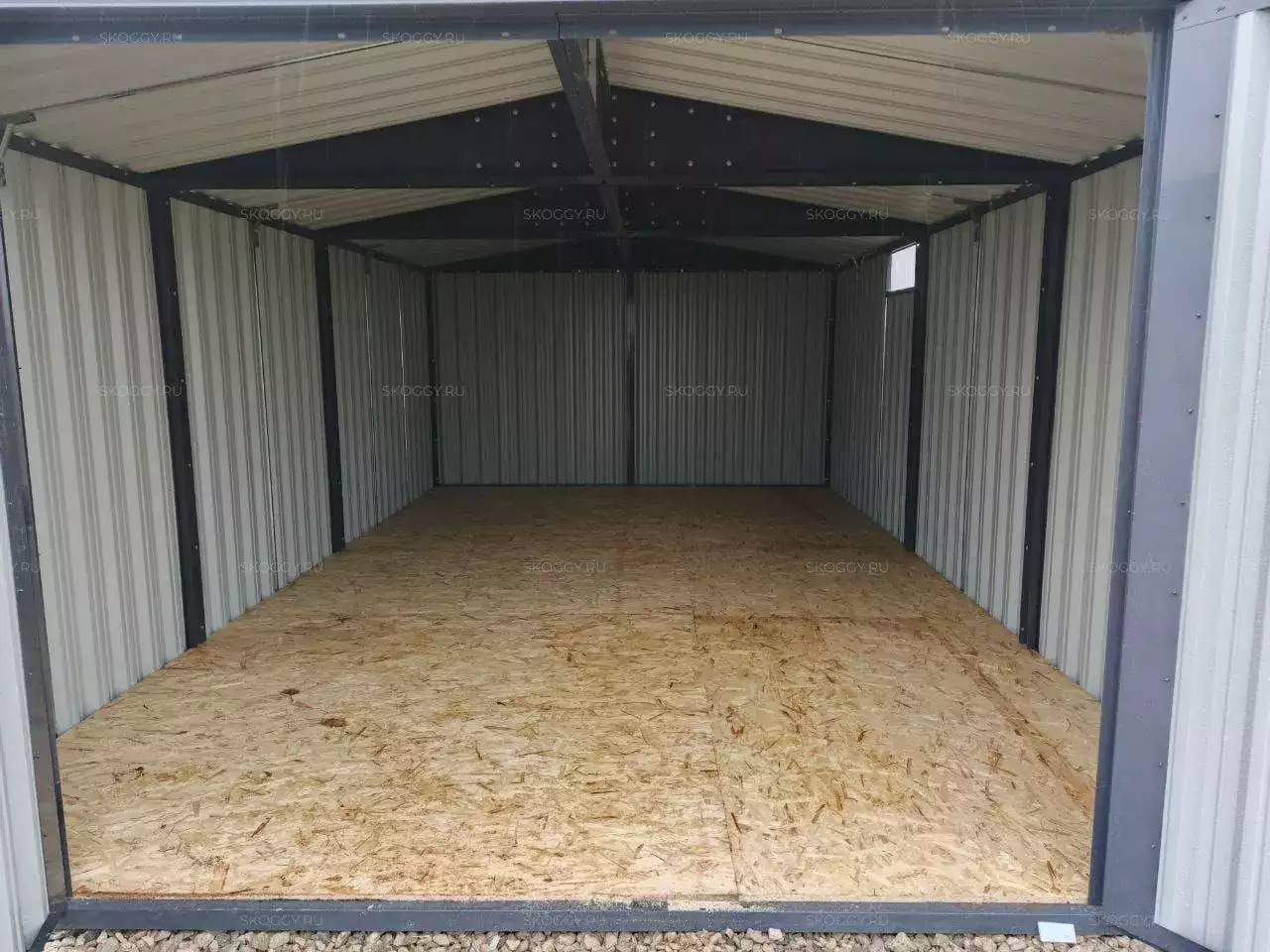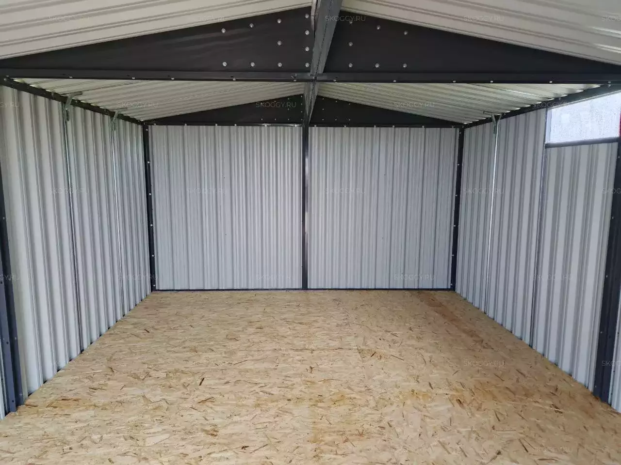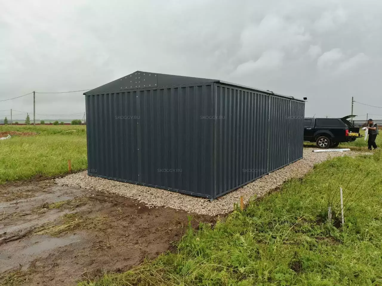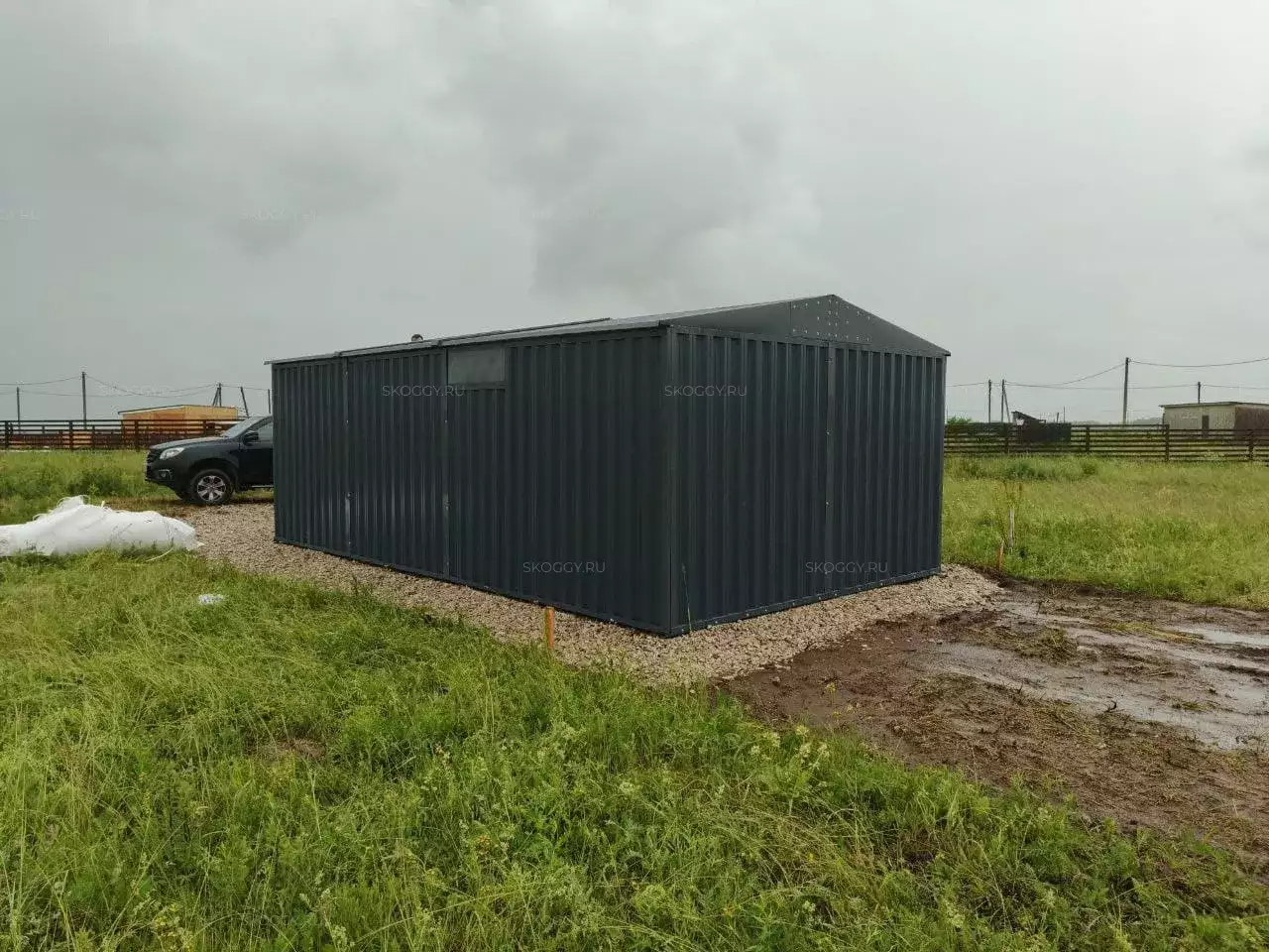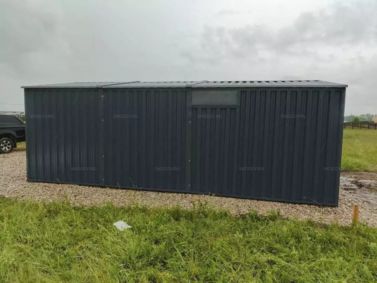 Нами была изготовлена широкая конструкция размером 5 х 4 х 2,69 м с двускатной крышей и торцевой воротной группой в строгом графитовом цвете RAL 7024.