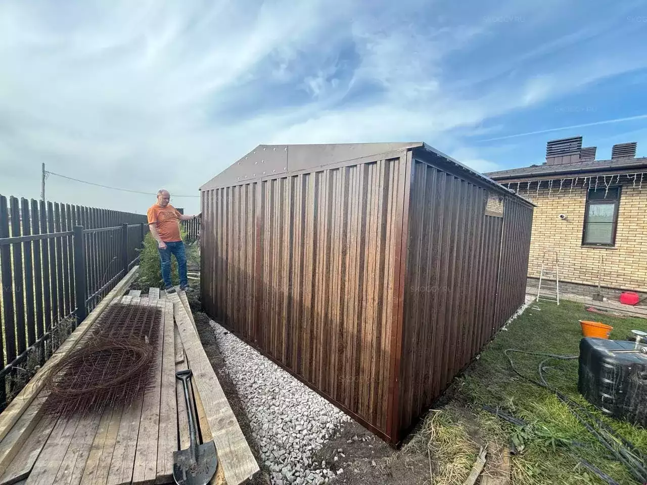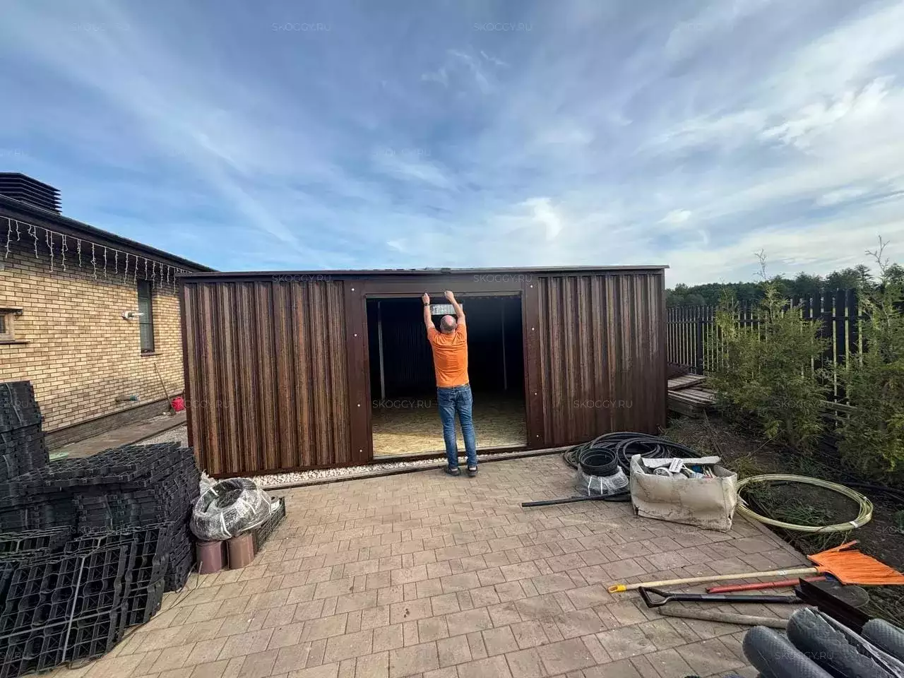 Проект: широкий хозблок 6 х 4,22 х 2,69 м для хранения квадроцикла, садовой техники и вещей в расцветке "под дерево".