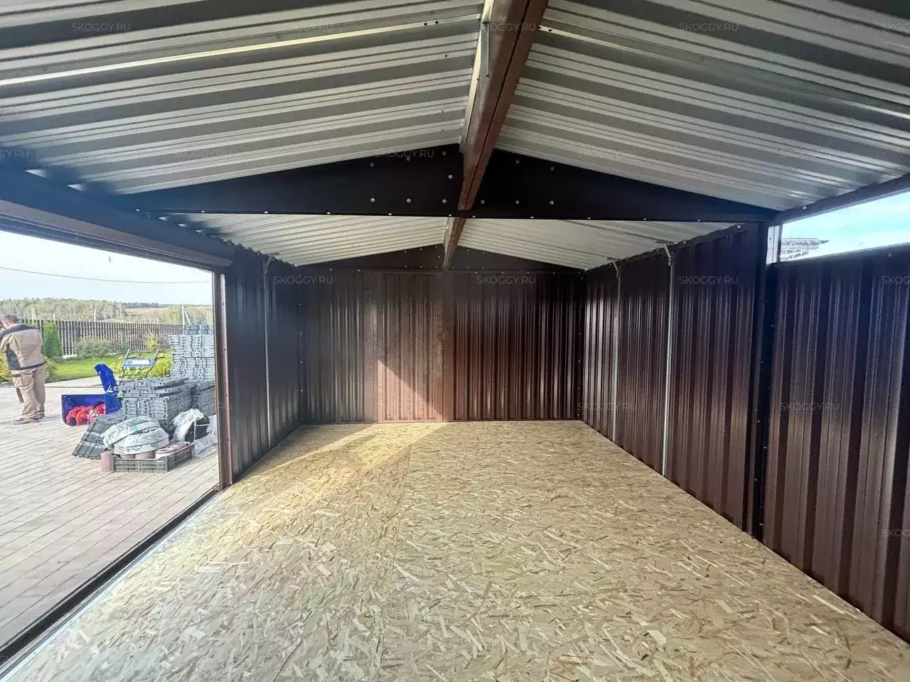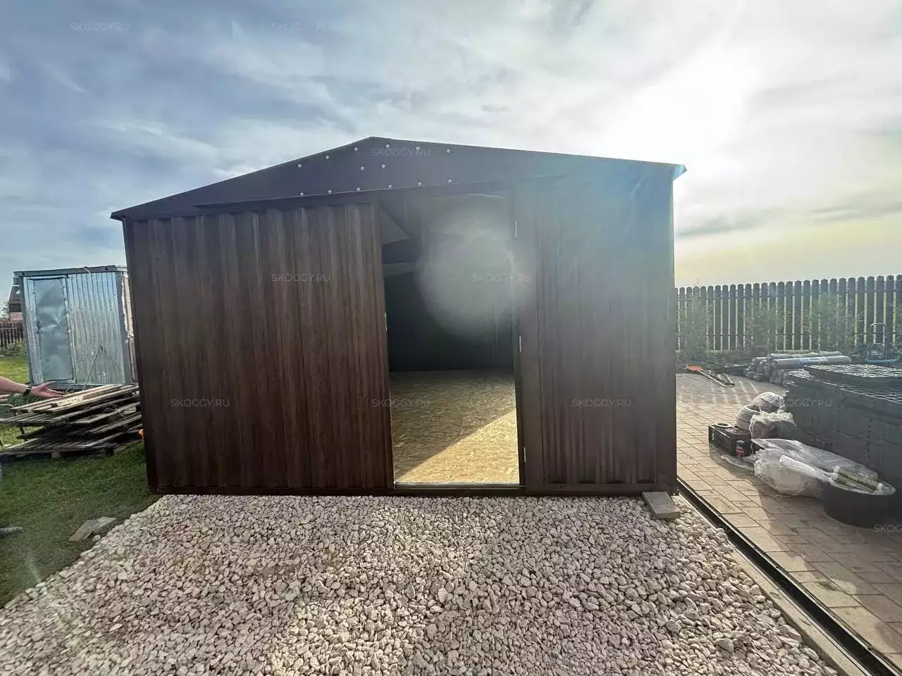 Дополнительно хозблок оборудовали входной дверью шириной 1 м по торцевой стороне, а также установили световое окно 90 х 30 см для проникновения естественного света внутрь постройки.