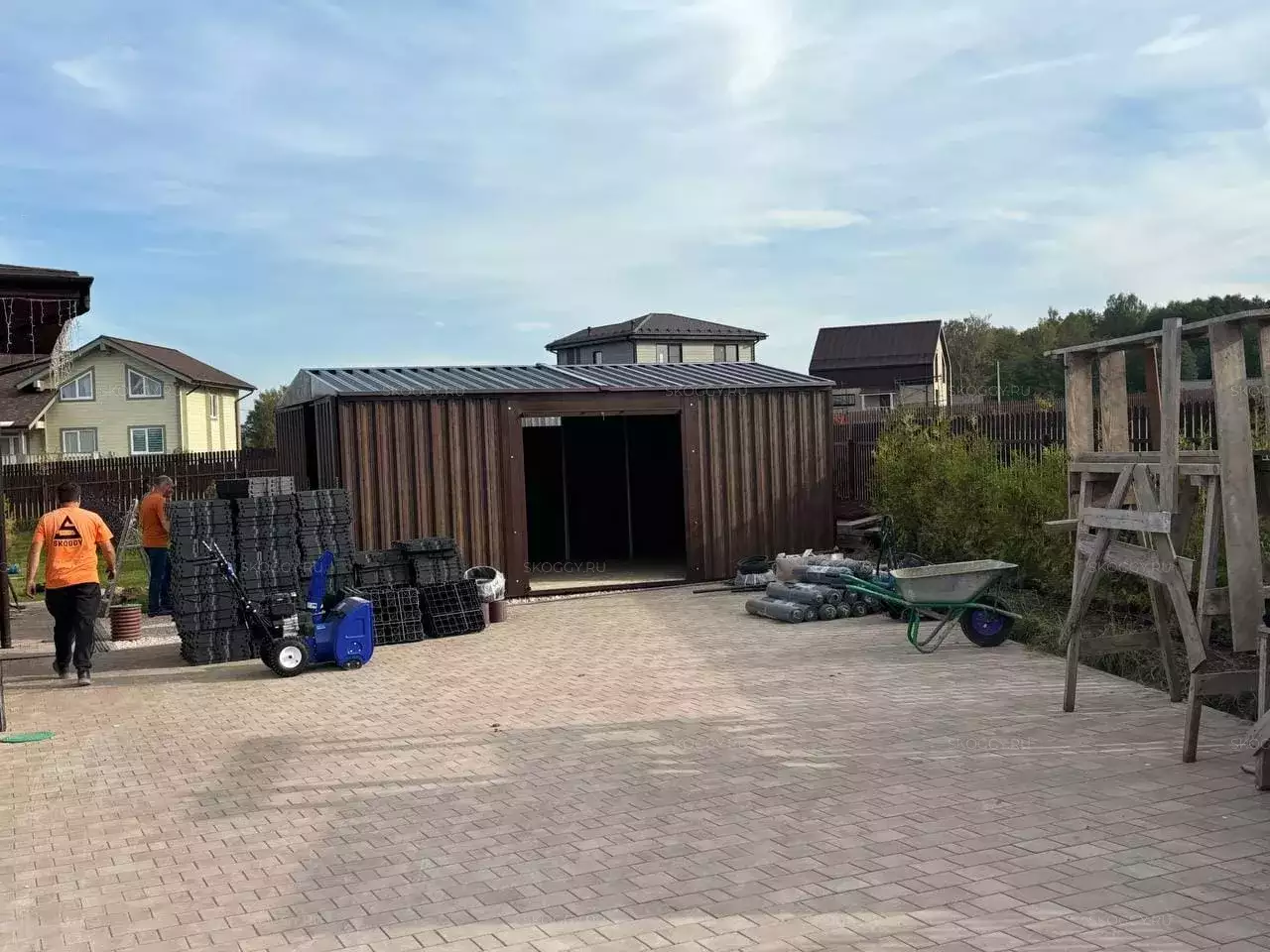 Заказчик этого проекта уже ранее приобретал у нас дровницу, а сейчас вернулся за еще одной конструкцией. Ему на участок был необходим вместительный хозблок для хранения квадроцикла, снегоуборочной техники и прочих хозяйственных вещей.