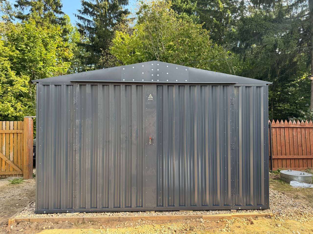 Нами была изготовлена широкая 3-метровая конструкция с двускатной крышей и торцевой воротной группой в стильном графитовом цвете RAL 7024.