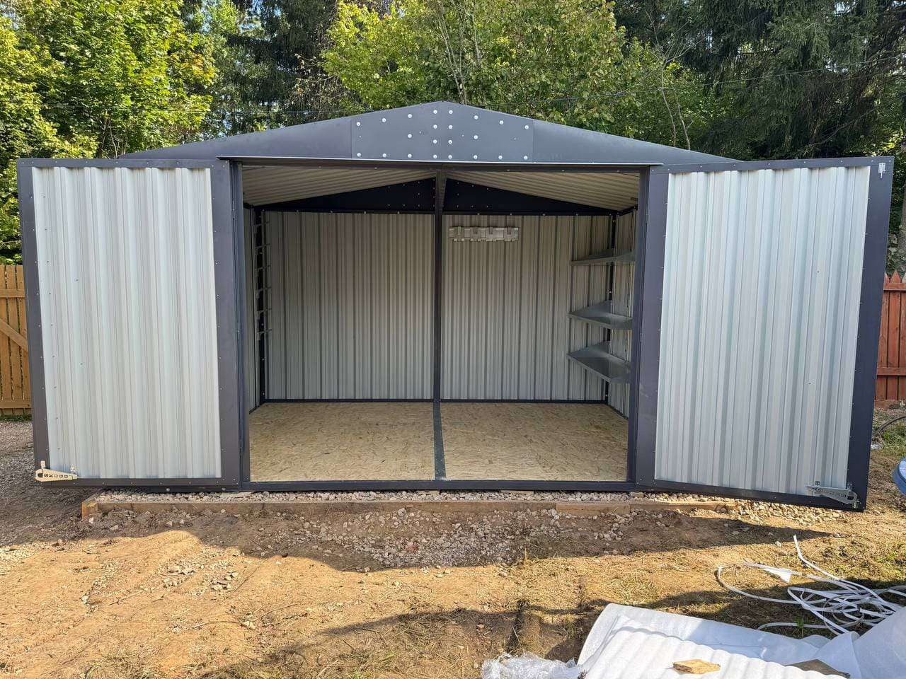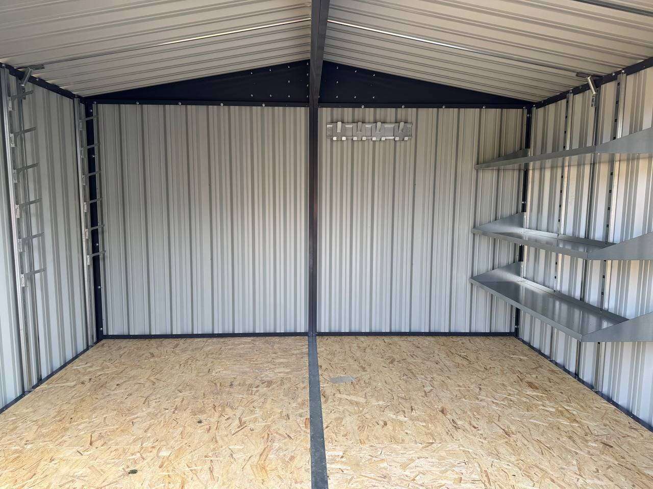 Дополнительно гараж оборудован системой хранения инвентаря, прямым стеллажом с тремя полками, системой подвесов и упорами для распашных ворот.