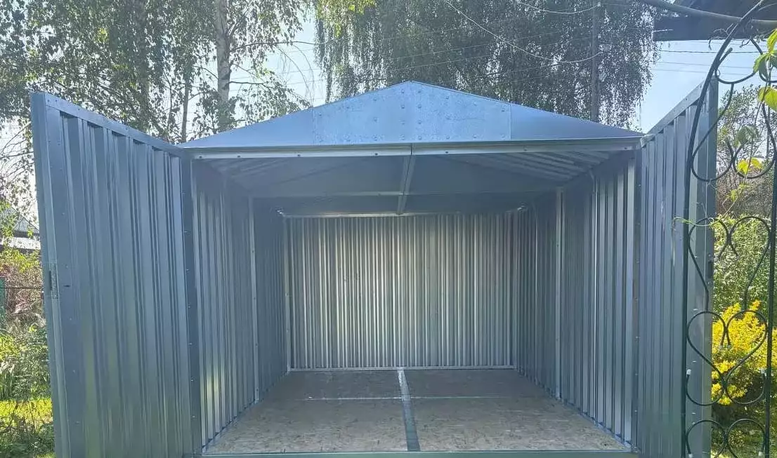 Нами была изготовлена конструкция размером 4 х 3 м с двускатной крышей и торцевой воротной группой в блестящем цинковом цвете.