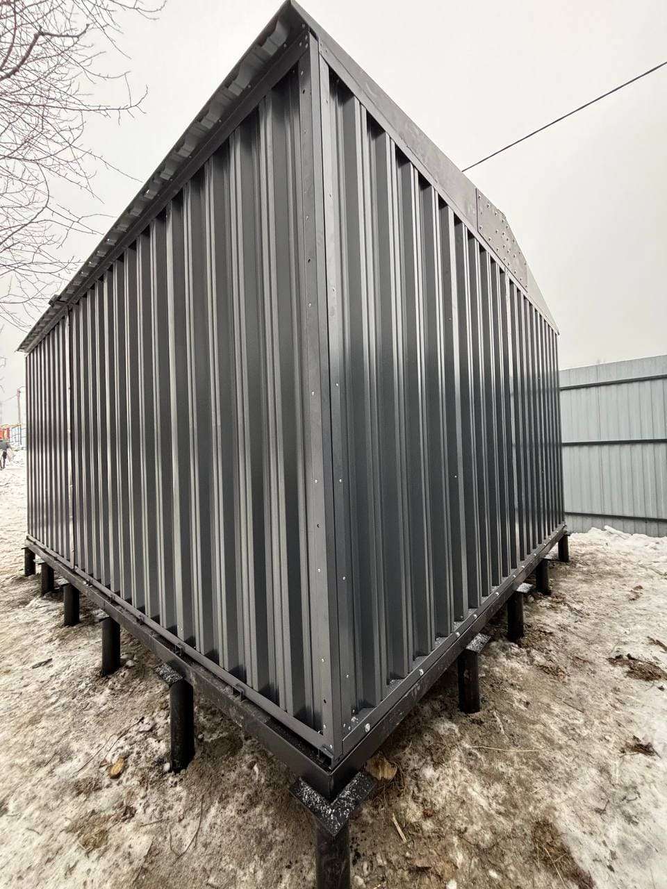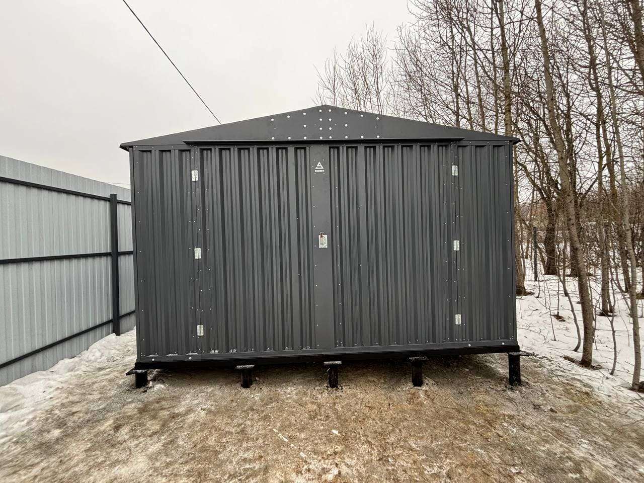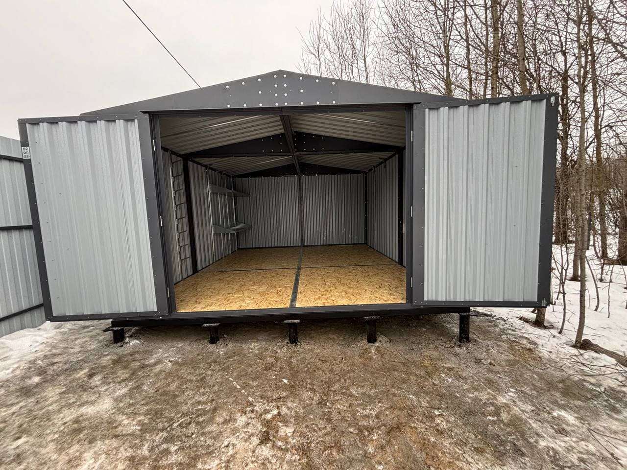 Нами была изготовлена широкая 5-метровая конструкция с двускатной крышей и торцевой воротной группой в строгом графитовом цвете RAL 7024.