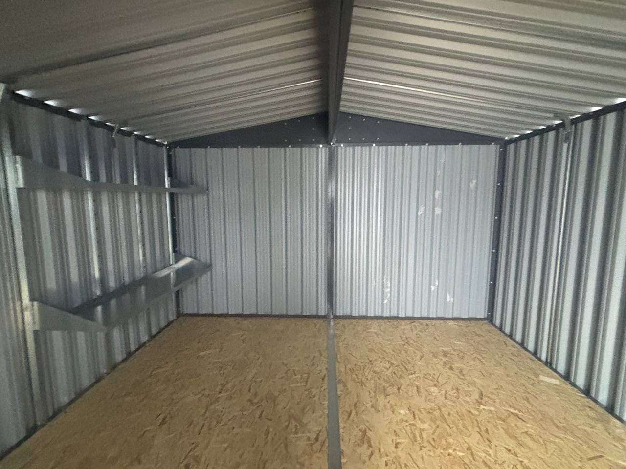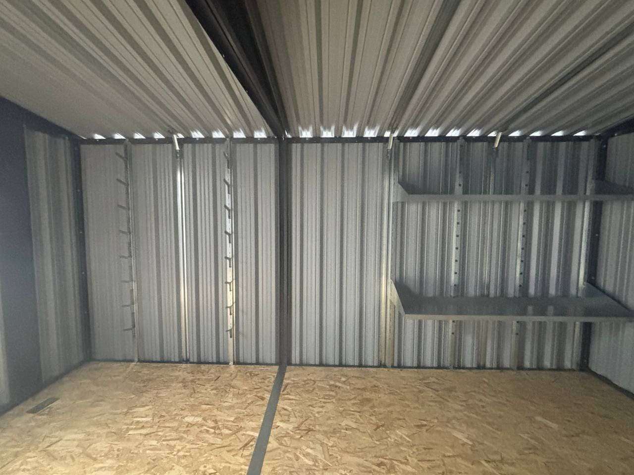 Дополнительно хозблок оборудовали прямым стеллажом с двумя полками, а также системой хранения инвентаря.