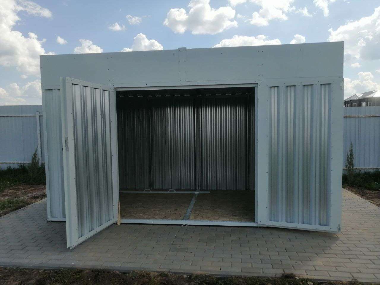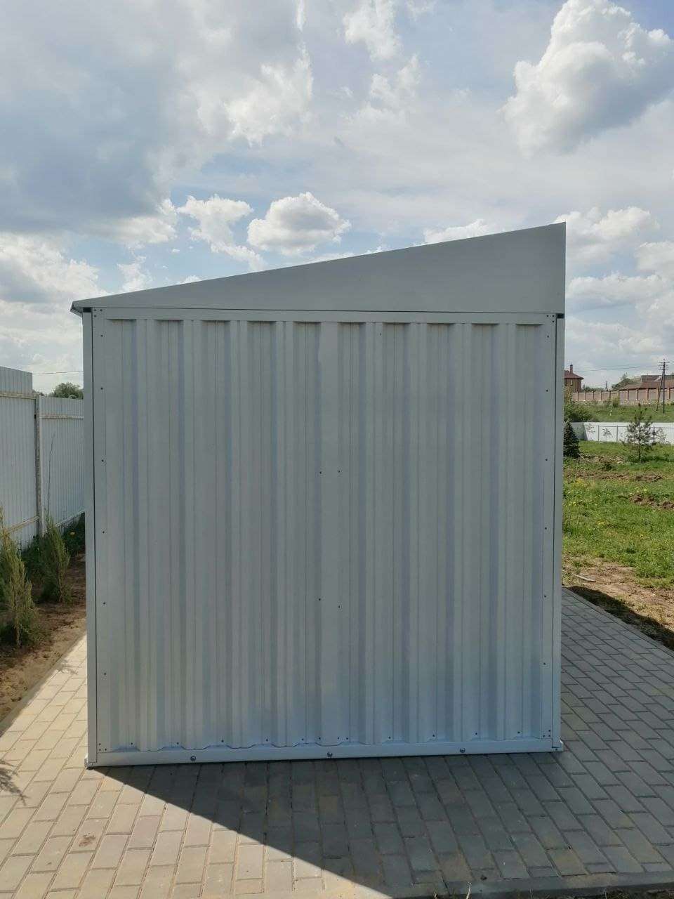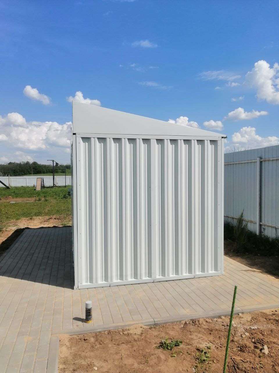 Нами была изготовлена стандартная 4-метровая конструкция с односкатной крышей и боковой воротной группой в светло-сером цвете RAL 7035.
