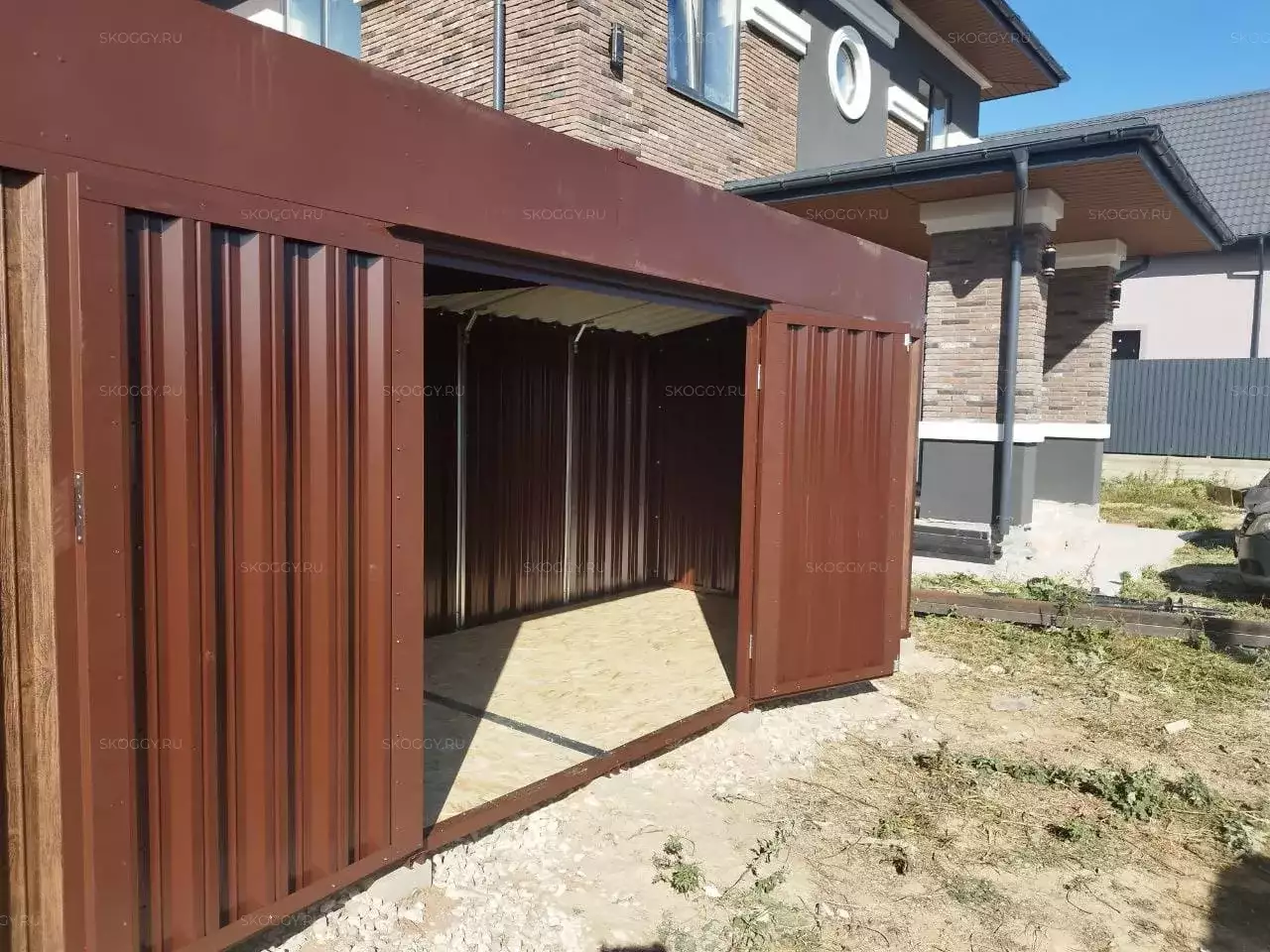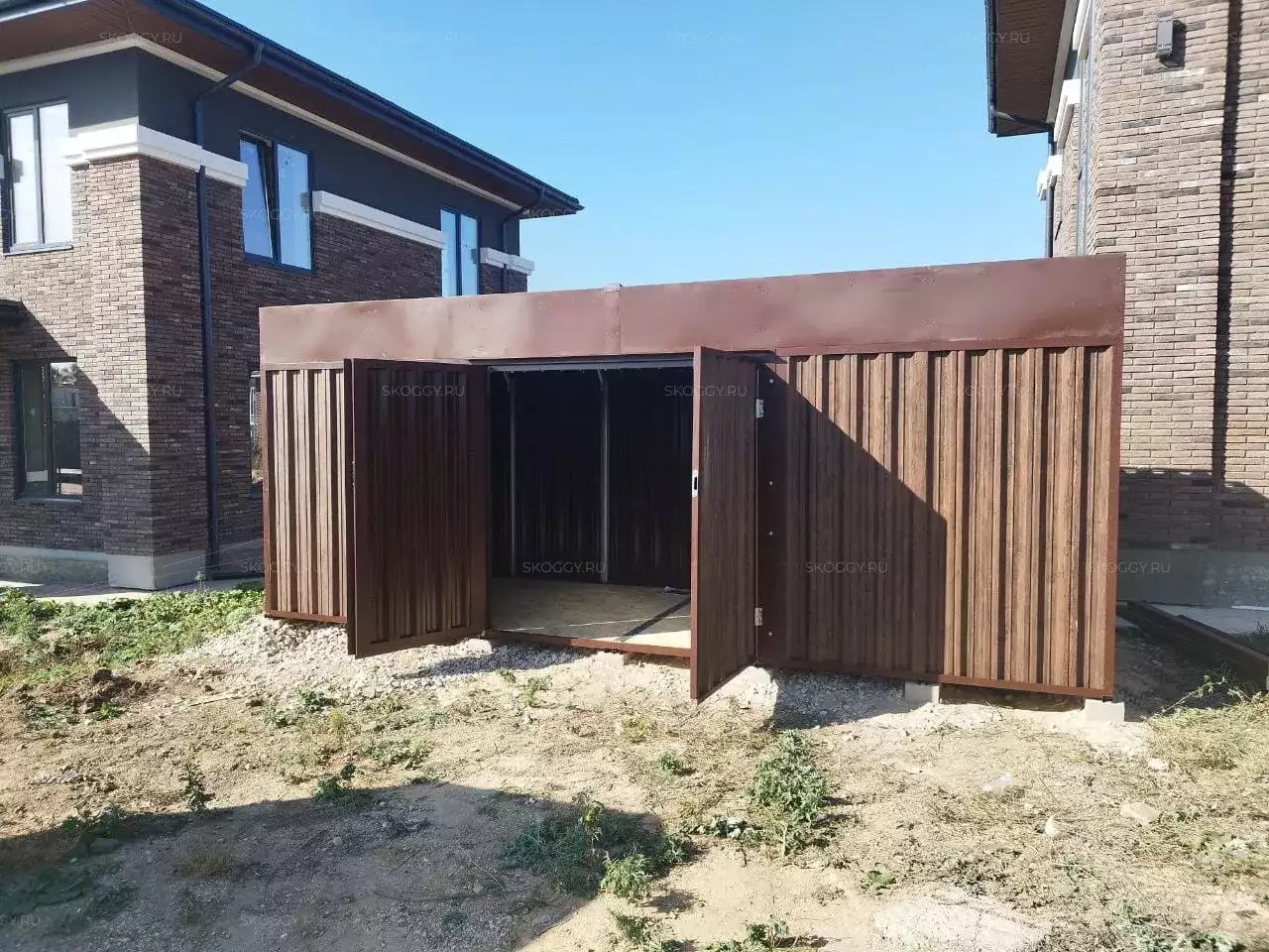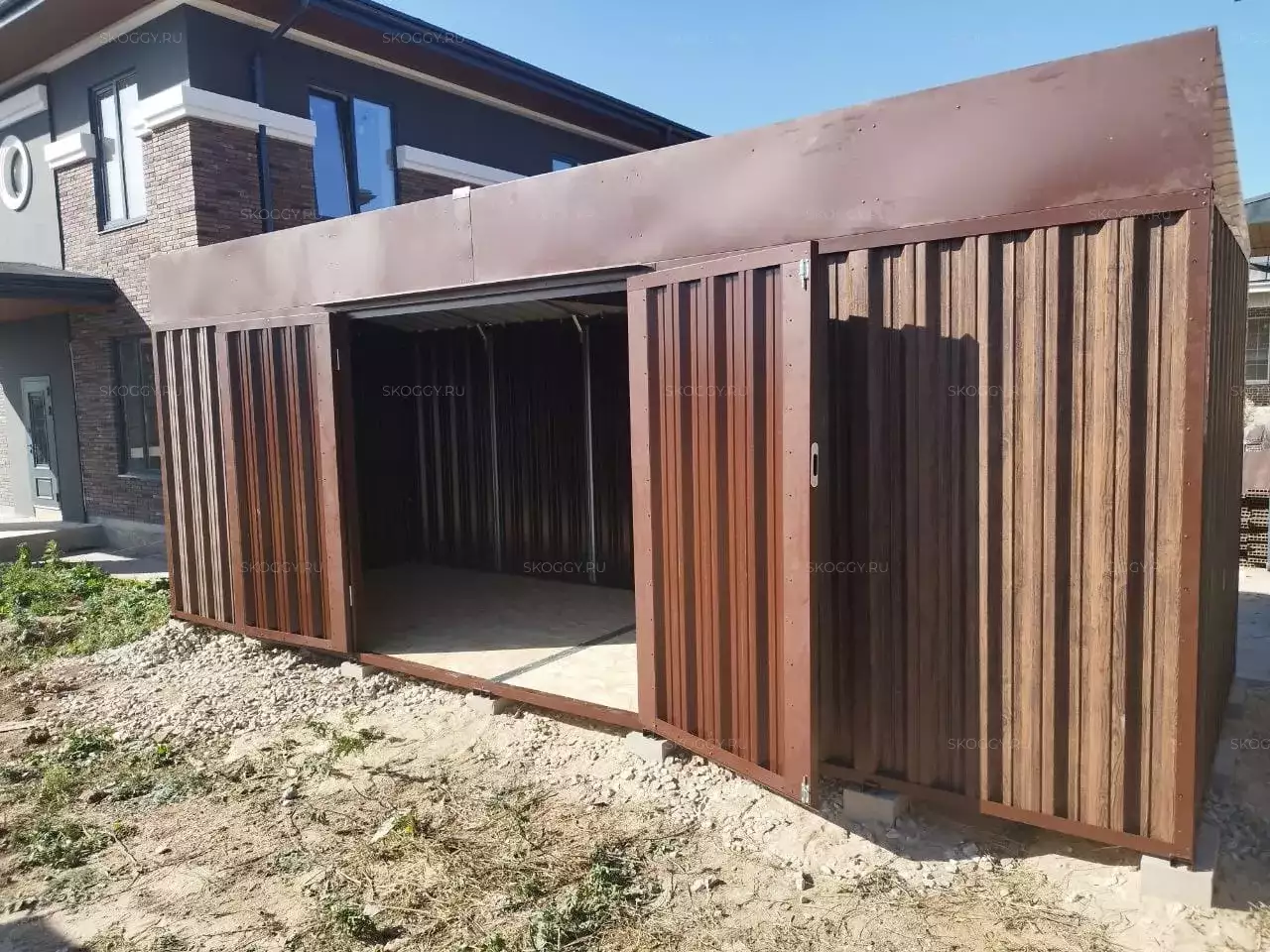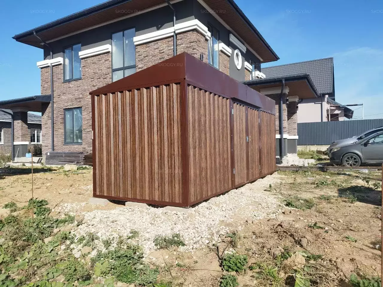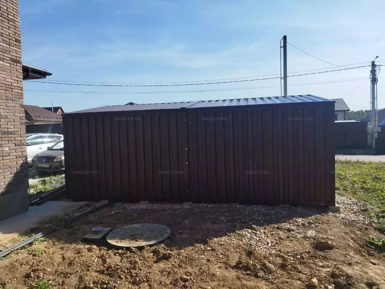 Нами была изготовлена стандартная 6-метровая конструкция с односкатной крышей и боковой воротной группой в стильной расцветке «под дерево» Темный дуб. Такая расцветка была выбрана, чтобы постройка сочеталась под цвет жилого дома на участке.