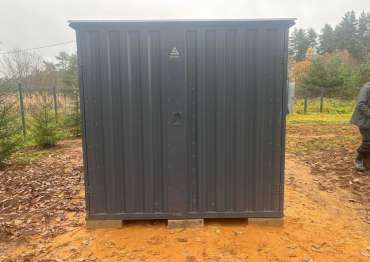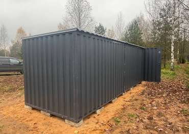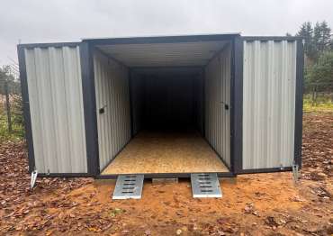 Нами была изготовлена стандартная 6-метровая конструкция с плоской крышей и двумя воротными группами (с боковой и торцевой сторон) в строгом графитовом цвете RAL 7024.