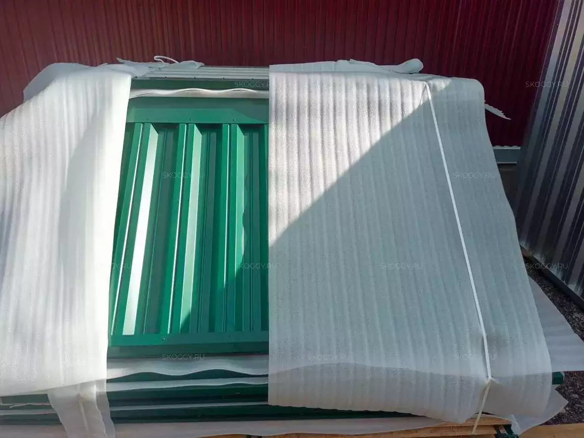 Изготовили для заказчика вместительный хозблок для хранения с двускатной крышей и торцевой воротной группой. Постройка приобрела стильный яркий окрас в цвет «зеленых мох» (RAL 6005) из стандартной палитры. Привезли в разобранном виде. Установили на выделенную твердую площадку.
