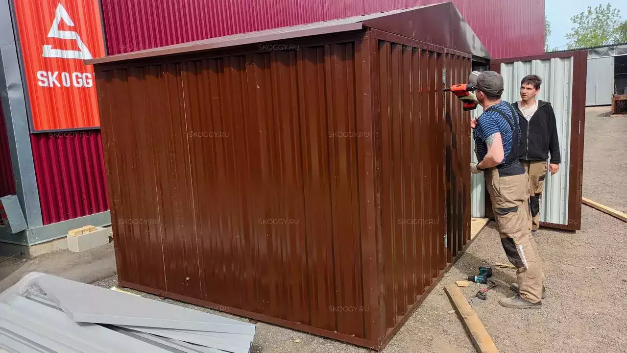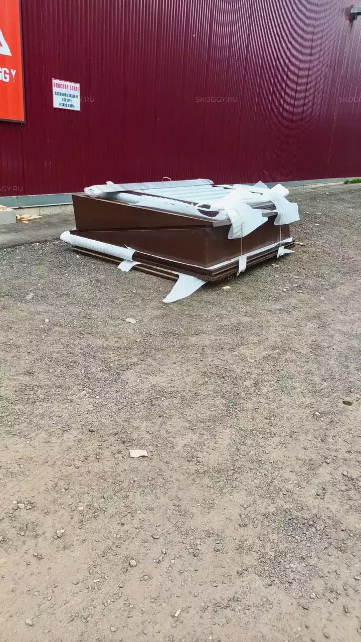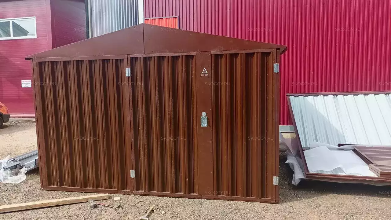 Изготовили конструкцию с двускатной крышей с увеличенной шириной 4,22 м и длиной 2,5 м. Окрас постройка получила в шоколадный цвет 8017 по каталогу RAL.