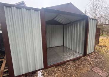 Нами была изготовлена стандартная 2-метровая конструкция с двускатной крышей и торцевой воротной группой в популярном шоколадно-коричневом цвете RAL 8017.