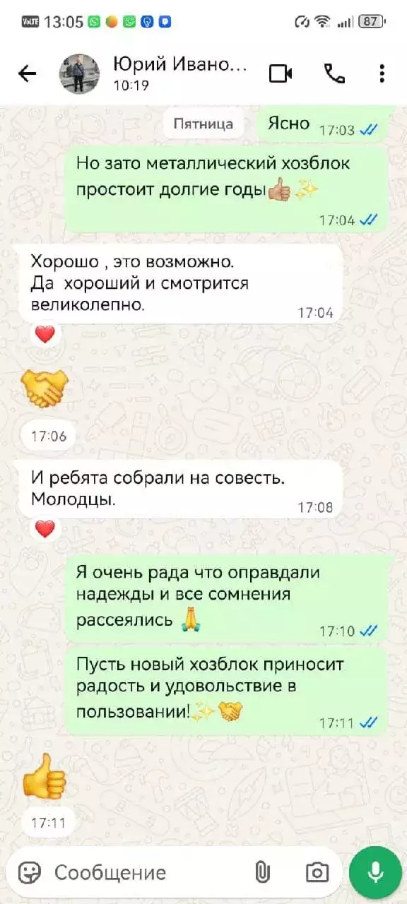 Доставляли хозблок на участок заказчика в разобранном виде. Нашими специалистами предоставлялись услуги по установке бетонных блоков и сборке изделия. Справились с задачей за 2,5 часа.