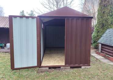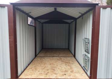 Нами была изготовлена стандартная 4-метровая конструкция с двускатной крышей и торцевой воротной группой в популярном шоколадно-коричневом цвете RAL 8017.