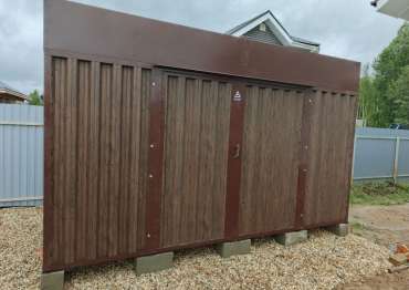 Нами была изготовлена стандартная 4- метровая конструкция с односкатной крышей и боковой воротной группой в популярной расцветке «под дерево» Темный дуб.