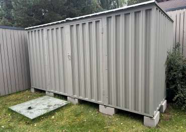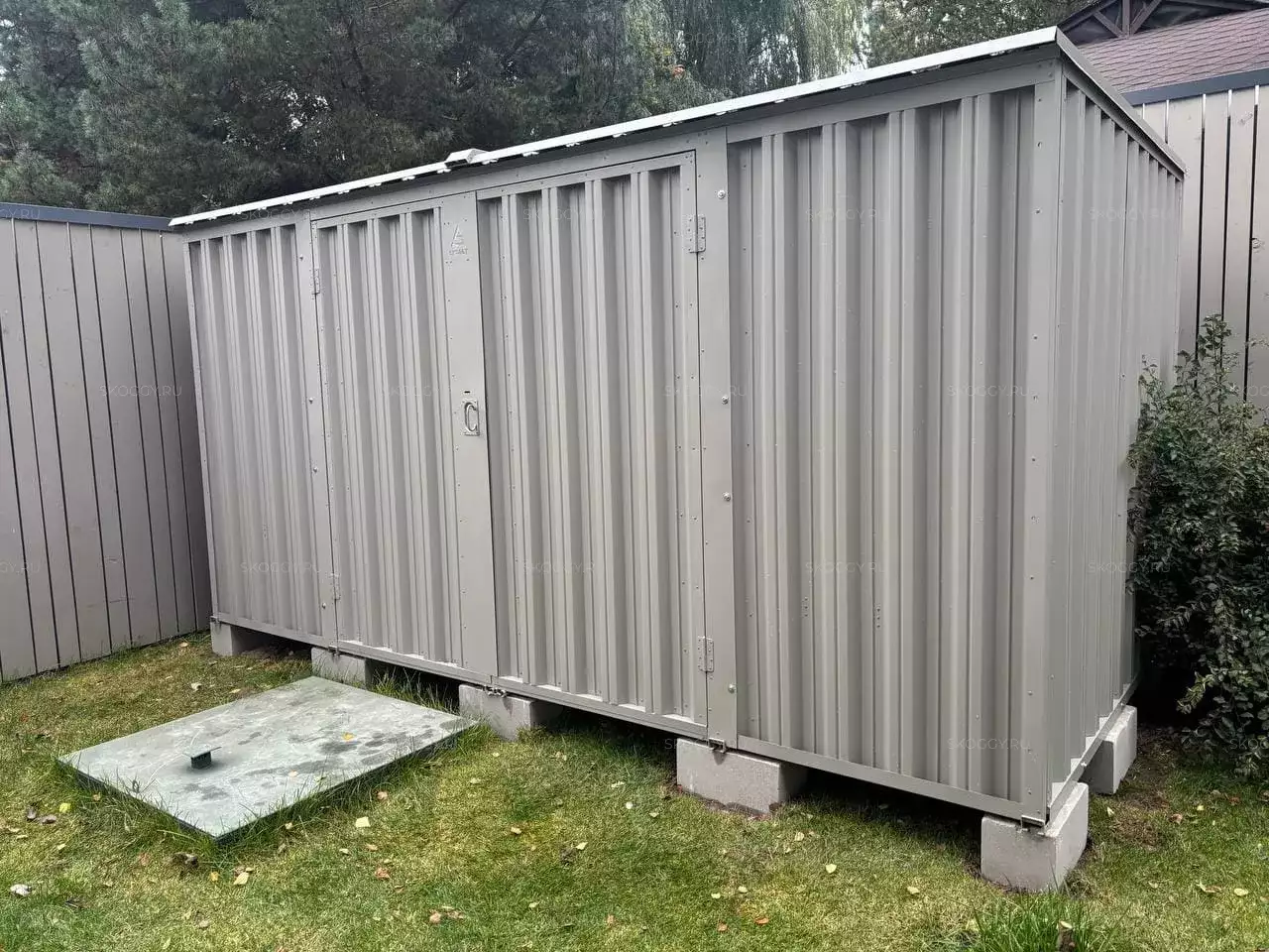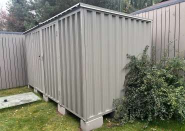Проект: 4-метровый хозблок для хранения садовой техники и инвентаря в каменно-сером цвете.