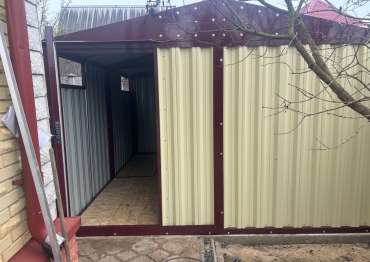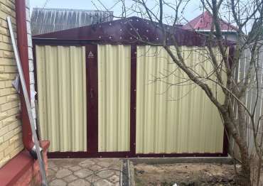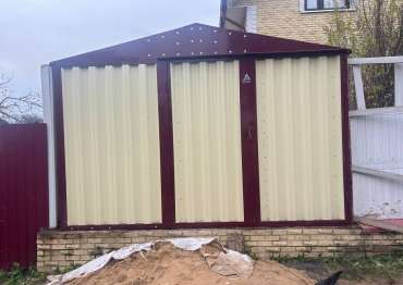 Нами была изготовлена конструкция размером 4,12 х 3,5 х 2,45 м с двускатной крышей и торцевой воротной группой в потрясающем сочетании расцветок RAL 1014 «слоновая кость» для основных элементов и винно-красного RAL 3005 для фасонных элементов и крыши. Именно такая расцветка была выбрана для того, чтобы постройка гармонировала по цвету с фасадом жилого дома на участке.