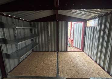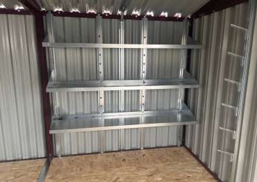 Дополнительно хозблок оборудован стеллажом с тремя полками, системой хранения инвентаря, двумя световыми окнами размером 90 х 30 см, а также дополнительной входной дверью шириной 1 м.