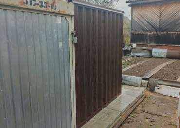 Нами была изготовлена конструкция размером 5 х 1,97 м с плоской крышей и боковой воротной группой в комбинации расцветок «под дерево» Темный дуб для основных элементов и шоколадно-коричневого RAL 8017 для фасонных элементов и крыши.