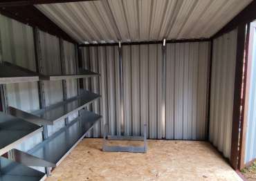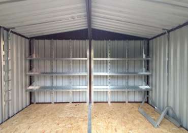 Дополнительно хозблок оборудован удобными стеллажами с тремя полками, системой хранения инвентаря, системой подвесов, а также напольной системой хранения шин.