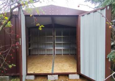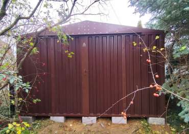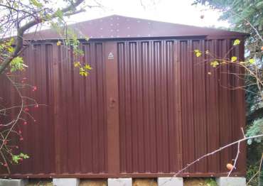 Нами была изготовлена широкая конструкция 3 х 4,22 х 2,69 м с двускатной крышей и торцевой воротной группой в неизменно популярном шоколадно-коричневом цвете RAL 8017.