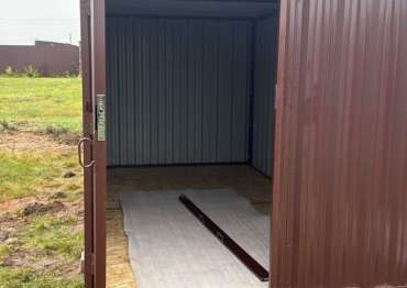 Нами была изготовлена стандартная 4-метровая конструкция с плоской крышей и торцевой воротной группой в неизменно популярном шоколадно-коричневом цвете RAL 8017.