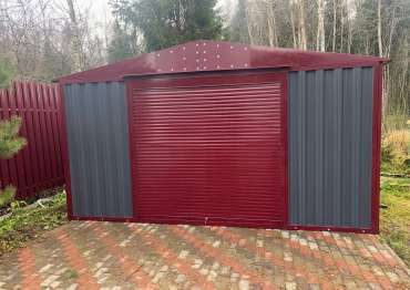 Нами была изготовлена широкая 4-метровая конструкция с двускатной крышей и торцевой входной группой с рольставнями в необычном сочетании цветов графитового RAL 7024 для основных элементов и винно-красного RAL 3005 для фасонных элементов, крыши и рольставней.