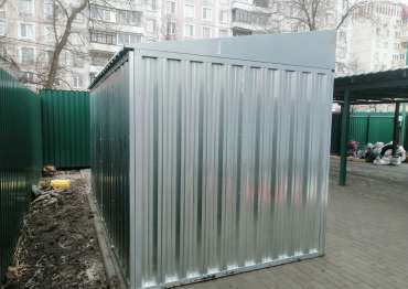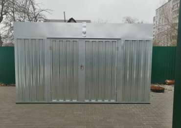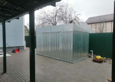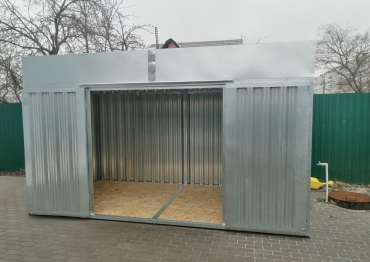 Нами была изготовлена стандартная 4-метровая конструкция с односкатной крышей для естественного схода осадков и боковой воротной группой в блестящем цинковом цвете.