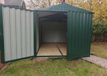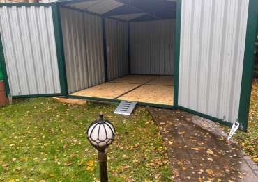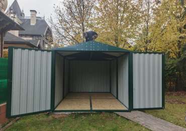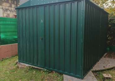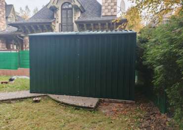 Нами была изготовлена конструкция размером 4 х 3 х 2,69 м с двускатной крышей и торцевой воротной группой в ярком зеленом цвете RAL 6005.