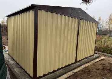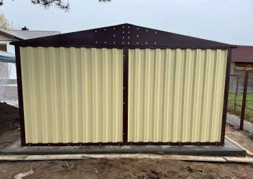 Нами была изготовлена широкая 3-метровая конструкция с двускатной крышей и торцевой воротной группой в потрясающе красивом сочетании расцветок нежного RAL 1014 «слоновая кость» для основных элементов и шоколадно-коричневого RAL 8017 для фасонных элементов и крыши. По желанию заказчика изделие выполнено из листа толщиной 0,7 мм.