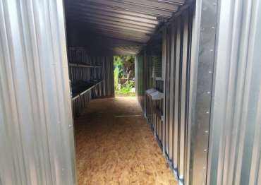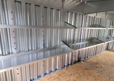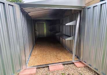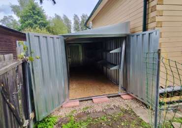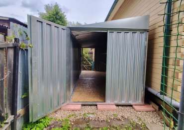 Нами была изготовлена стандартная 6-метровая конструкция с односкатной крышей и торцевой воротной группой в блестящем цинковом цвете. С противоположного торца была добавлена дополнительная дверь шириной 1 м для удобства входа с двух сторон.