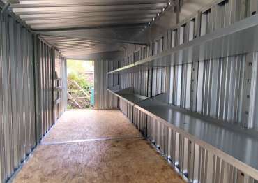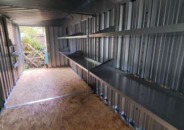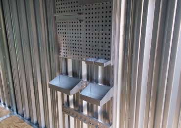 Дополнительно хозблок оборудован прямыми стеллажами, инструментальной панелью и системой хранения инвентаря.