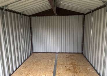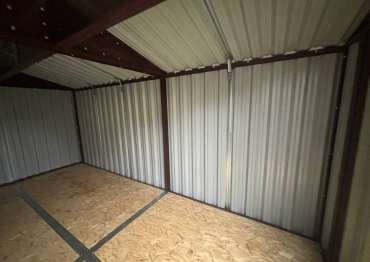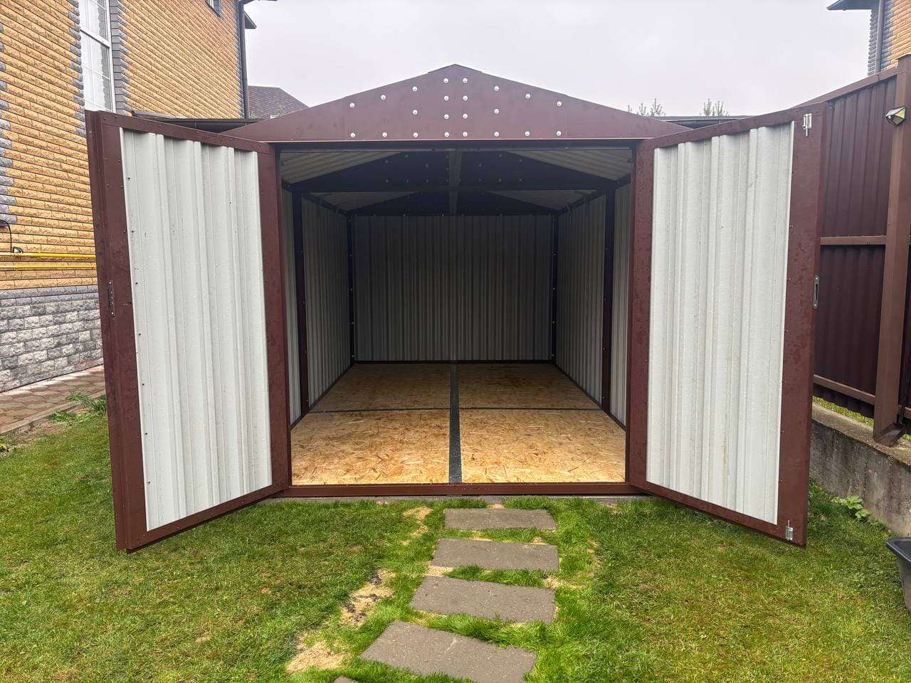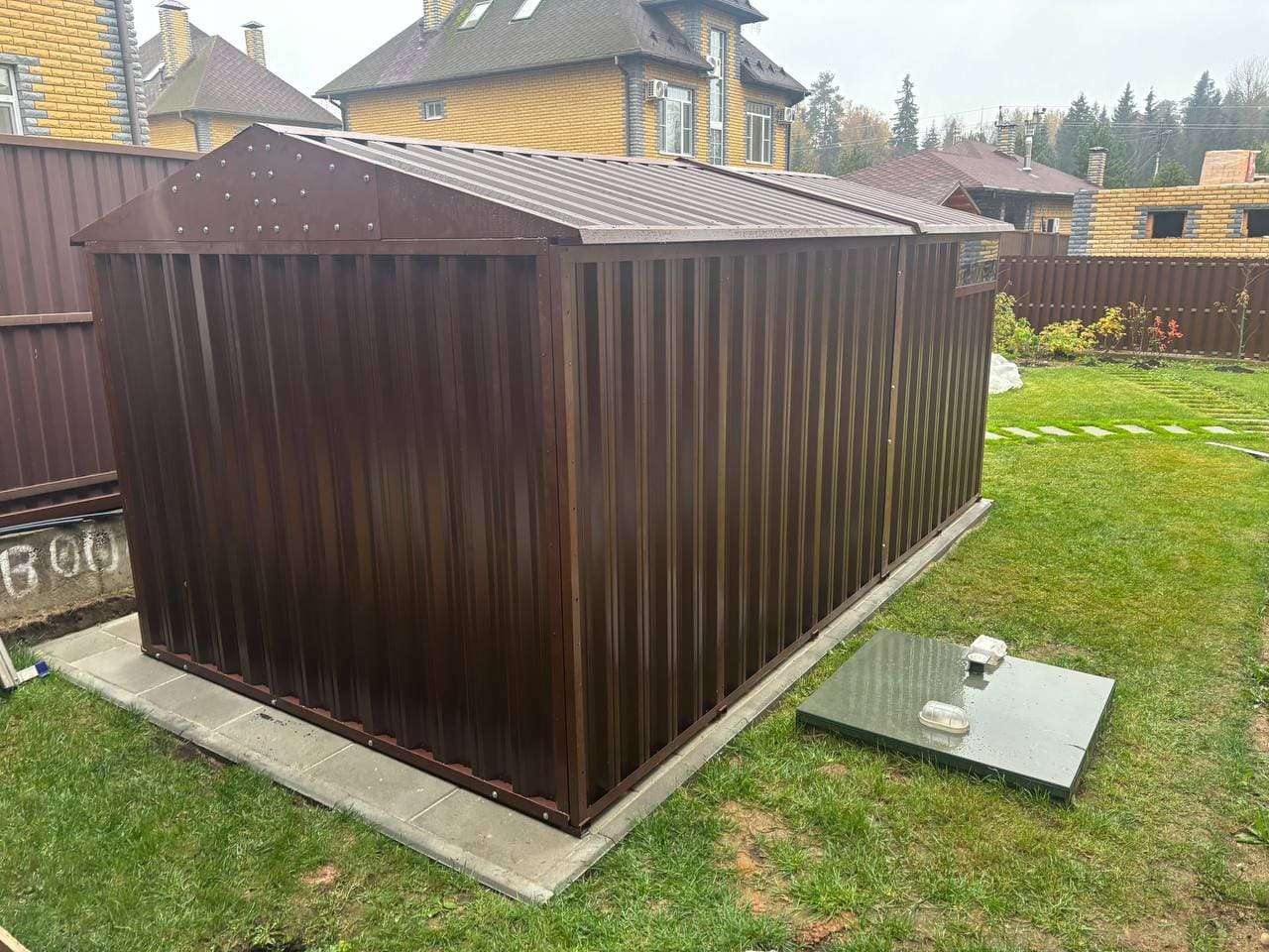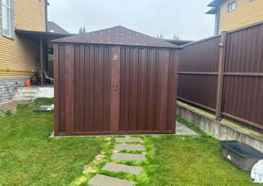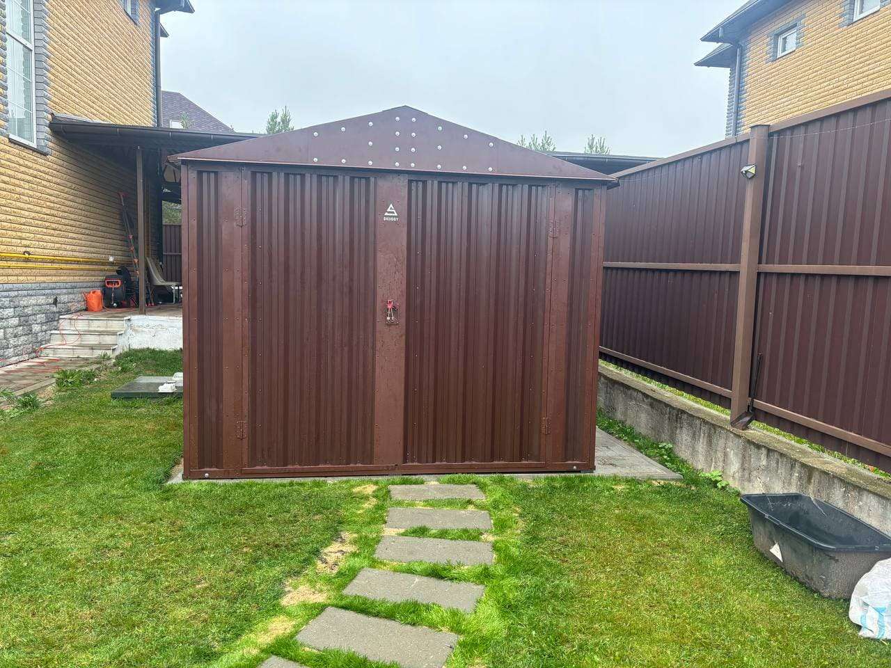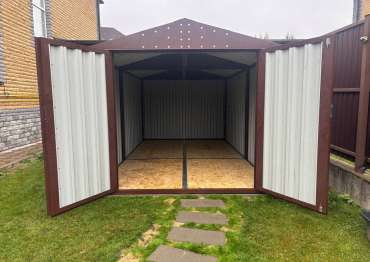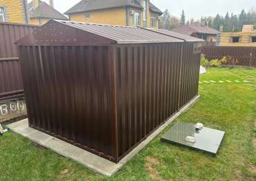Нами была изготовлена конструкция по индивидуальным параметрам размером 5 х 2,7 х 2,45 м с двускатной крышей и торцевой воротной группой в стильном и популярном шоколадно-коричневом цвете RAL 8017. Именно такая расцветка была выбрана для того, чтобы постройка гармонировала по цвету с забором на участке.