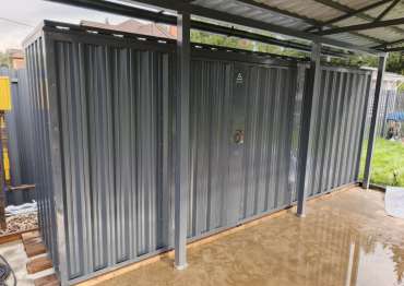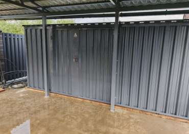 Нами была изготовлена конструкция по индивидуальным параметрам размером 5 х 1,3 х 2,06 м с плоской крышей и боковой воротной группой в строгом графитовом цвете RAL 7024. Этот цвет был выбран, чтобы постройка гармонировала с цветом жилого дома, навеса и забора на участке заказчика.