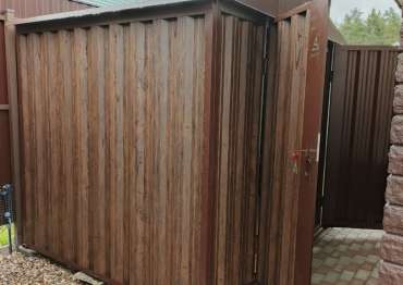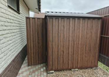 Нами была изготовлена нестандартная конструкция размером 2,06 х 3 х 2,45 м с двускатной крышей и торцевой воротной группой в стильной расцветке «под дерево» Темный дуб. Сторону, прилегающую к забору, решили оставить в шоколадно-коричневом цвете RAL 8017, так как она не доступна к обзору.