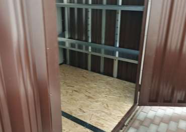 Дополнительно хозблок оборудован двумя прямыми стеллажами с двумя полками по обе стороны конструкции.