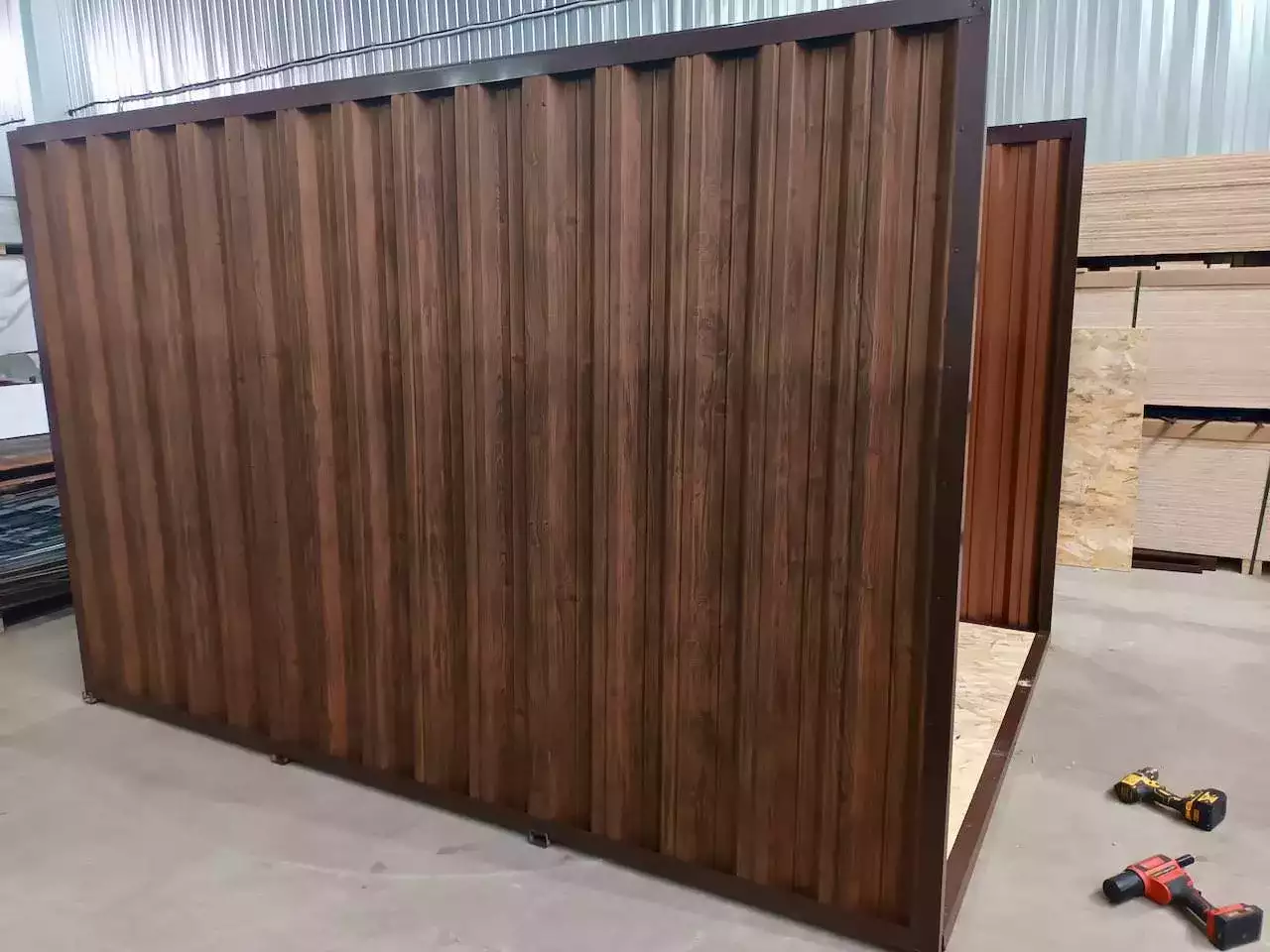 Цвет этого контейнера сделан «под дерево», но у нас можно выбрать любой оттенок из стандартной палитры RAL, нестандартные и индивидуальные принты – по запросу.