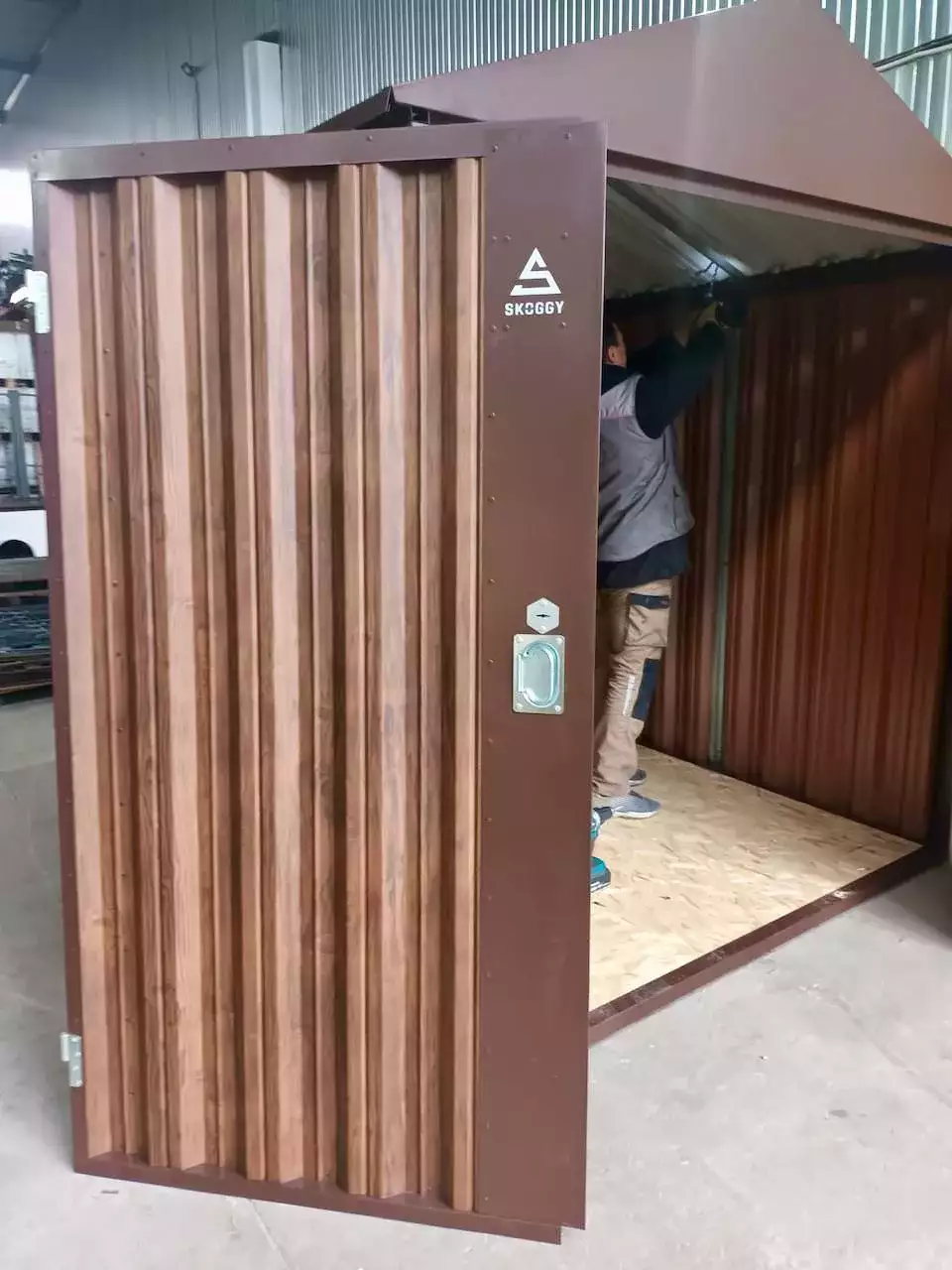 А история звездного взлета начиналась так: к нам обратился заказчик с задачей хранения мототехники. Была выбрана стандартная конструкция длиной 3 метра с двускатной крышей. Покупатель успел воспользоваться нашей акцией «Нанесение принта «под дерево» по цене окраски в цвет RAL».