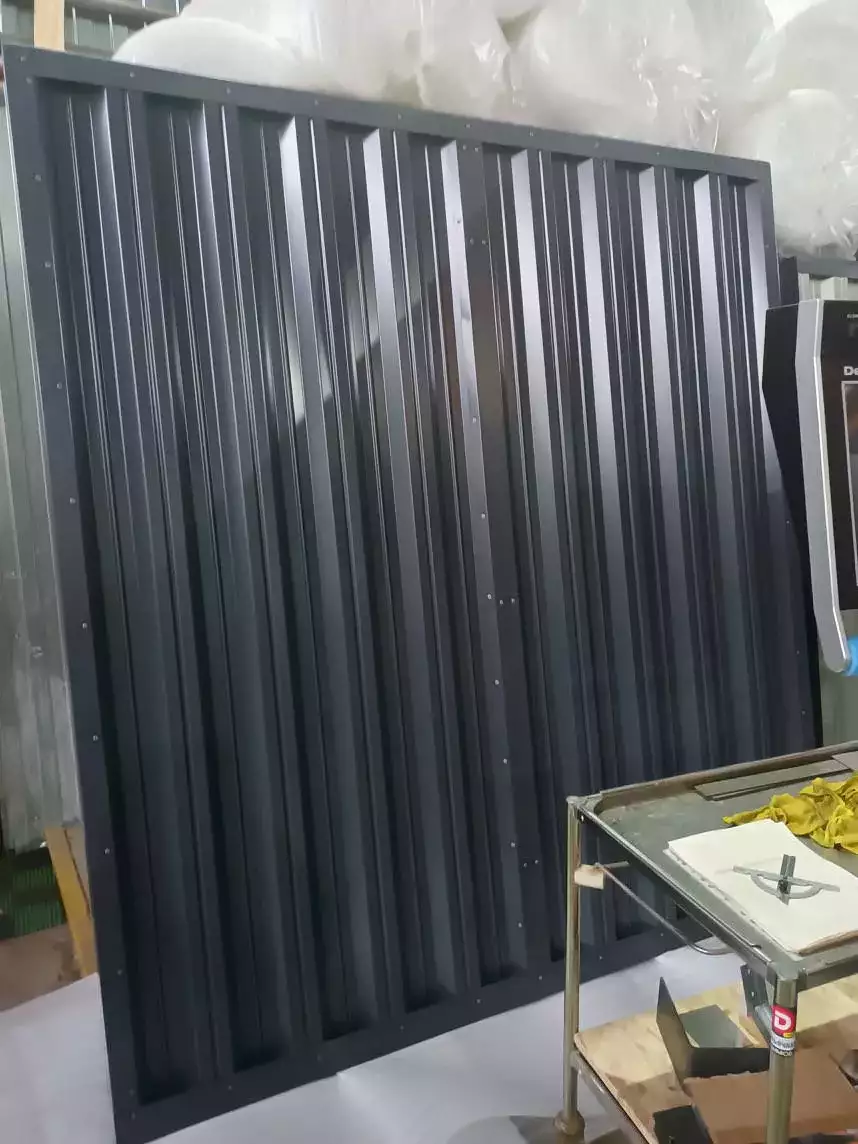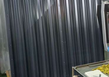 Цвет подбирался под забор - выбрали оттенок RAL 7004 (сигнальный серый), фасонные элементы и стеллажи в цвет RAL 7024 (графитовый серый).