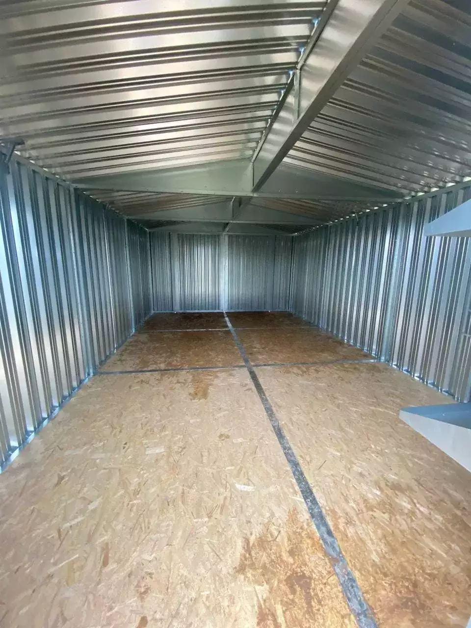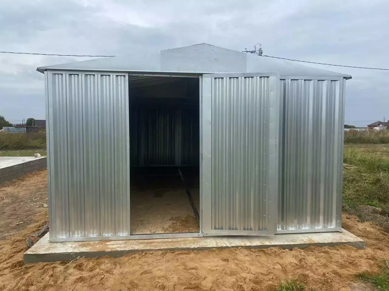 Нами была изготовлена широкая 7-метровая конструкция с двускатной крышей и торцевой воротной группой в блестящем цинковом цвете.