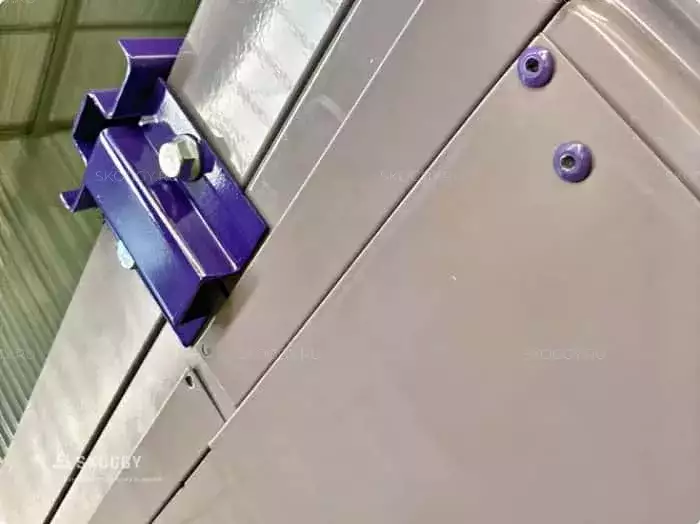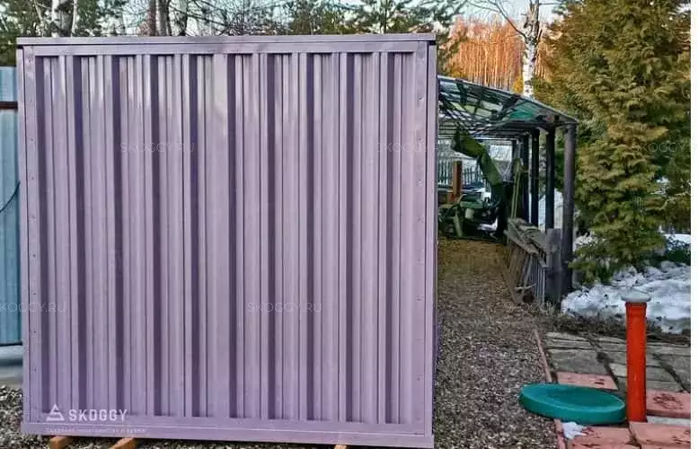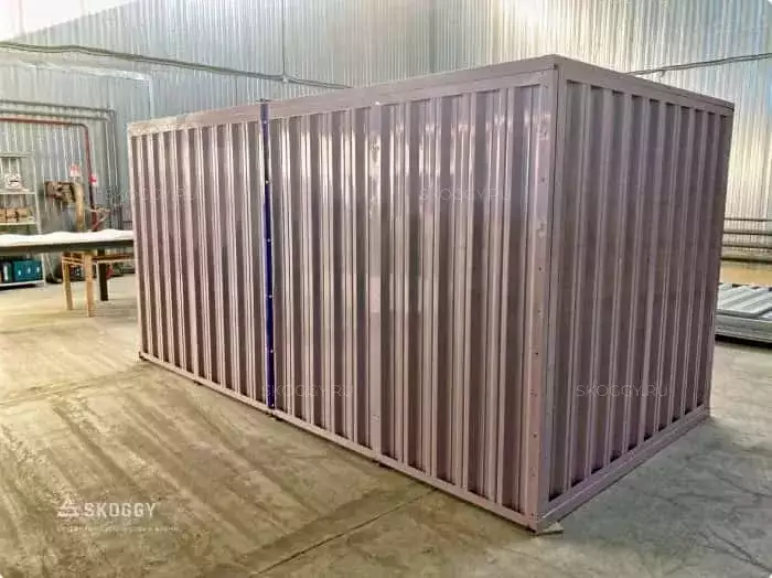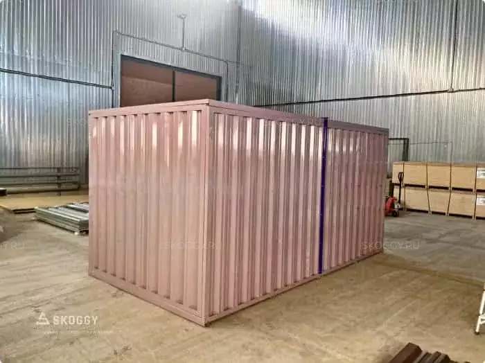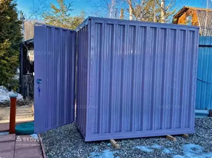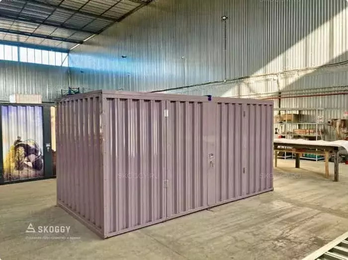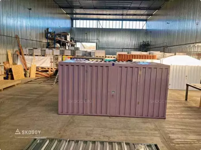Так как место для будущего помещения уже было подготовлено, мы предложили вариант, который подходит по размеру: стандартный блок-контейнер 4 м. Наши клиенты хотели, чтобы контейнер для инвентаря был нес не только практическую пользу, но еще и был красивым. Мы предложили им палитру цветов, заказчики выбрали нежный пастельно-фиолетовый цвет. Контейнер был окрашен методом порошковой окраски, который надолго обеспечивает яркость цвета.