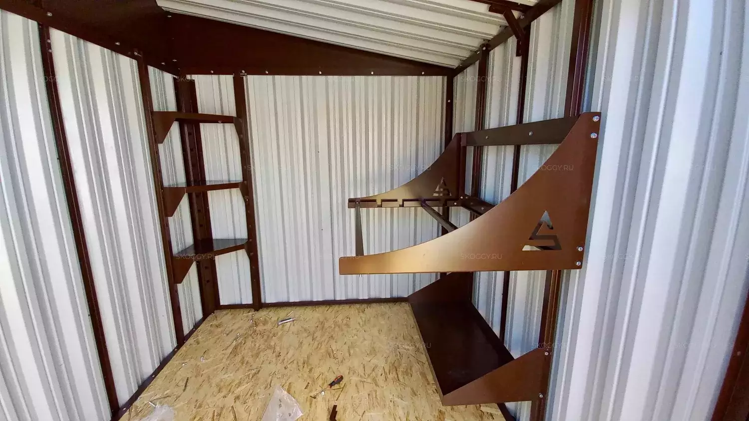 Дополнительно в блок-контейнер были установлены угловой стеллаж и система хранения шин на направляющих, что позволит хранить все необходимое в порядке.