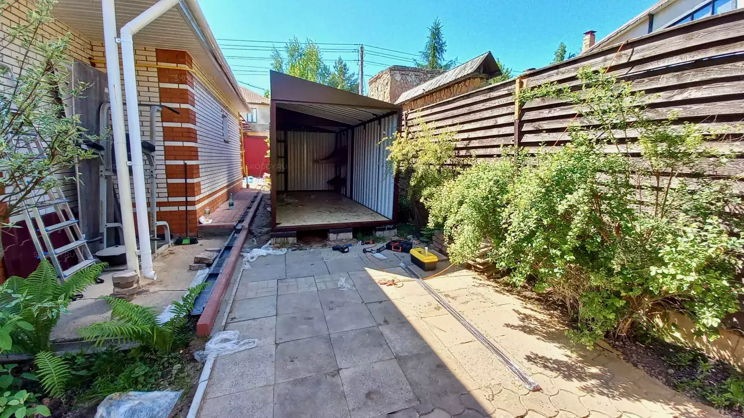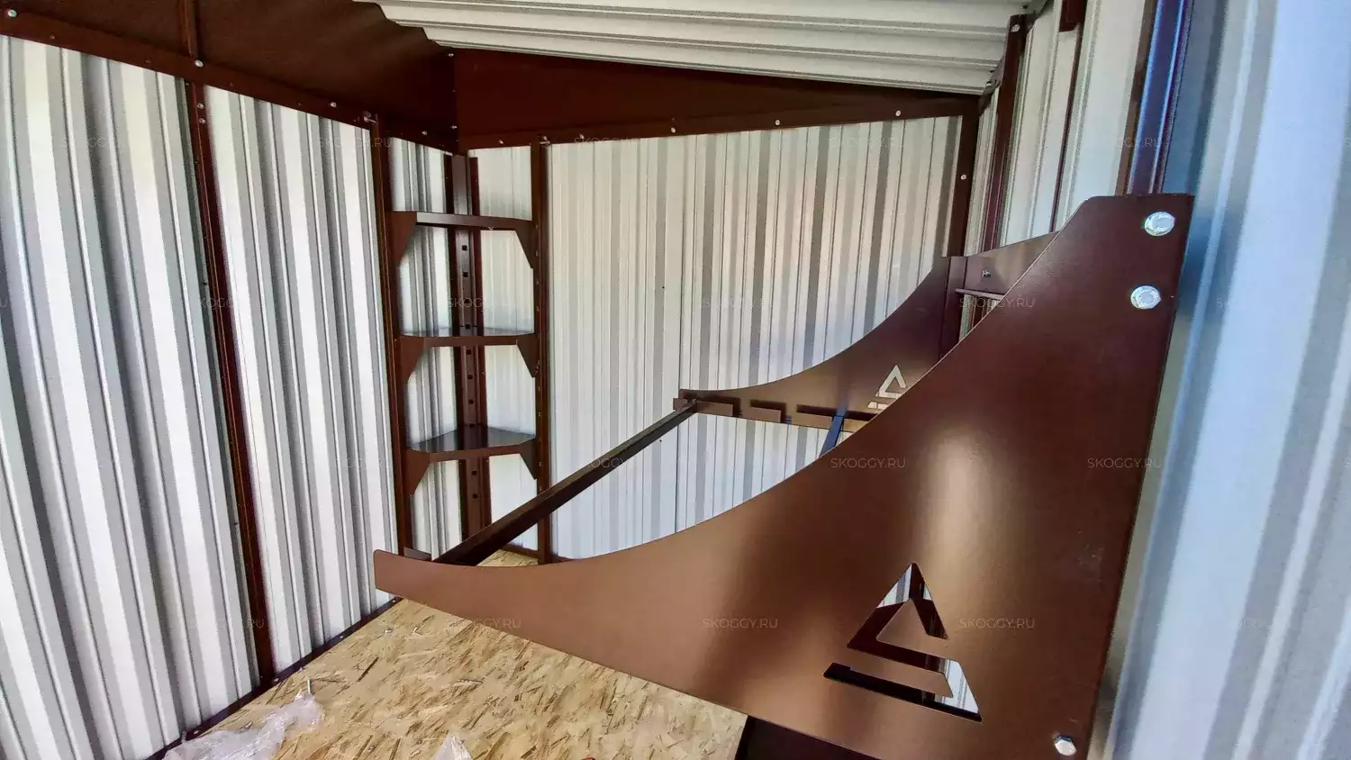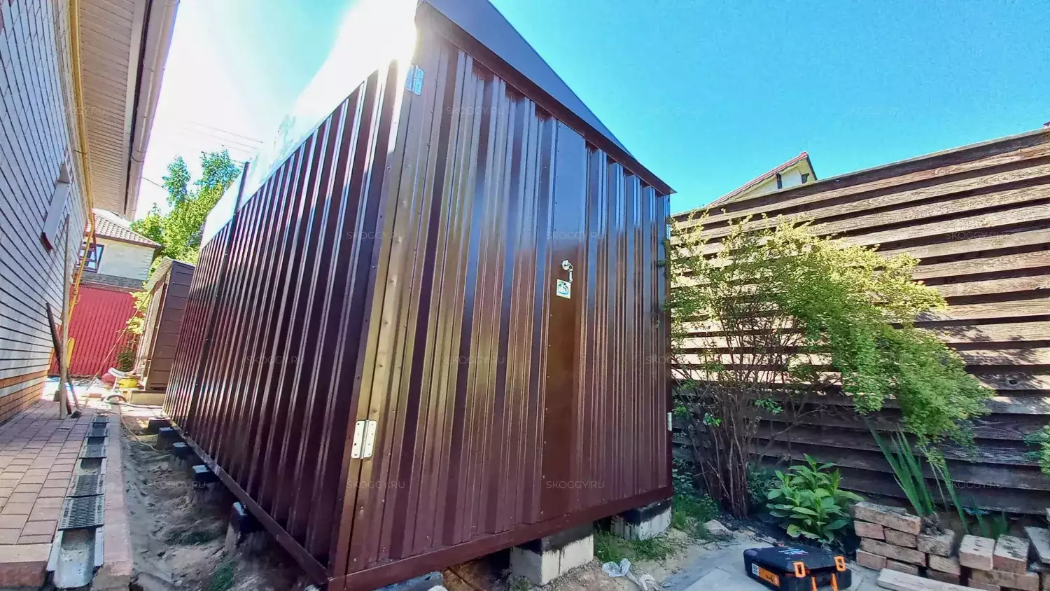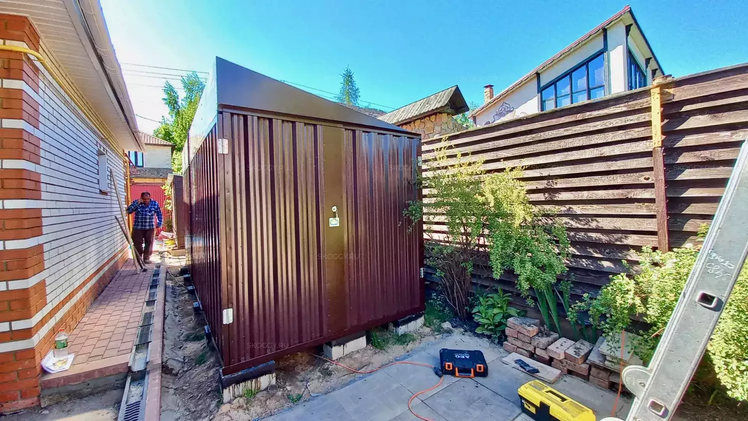 Так как Владимир планировал поставить контейнер одной стороной к дому, мы предложили ему односкатную крышу. Благодаря этому сарай выглядит как пристройка и удобен в использовании. Цвет был выбран из предложенной палитры. Остановился на оттенке RAL 8017 шоколадно-коричневый, так как он подходит к цвету крыши.