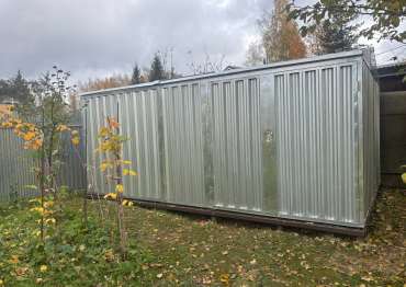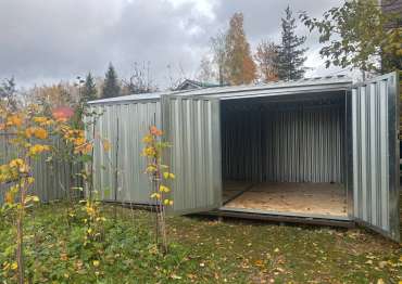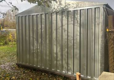 Нами была изготовлена нестандартная конструкция размером 5 х 3,5 х 2,4 м с двускатной крышей и боковой воротной группой в блестящем цинковом цвете.