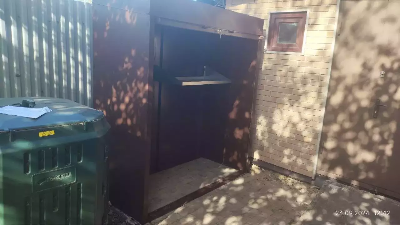 Нами была изготовлена конструкция размером 0,9 х 1,9 х 2,1 м с рольставнями в популярнейшем шоколадно-коричневом цвете RAL 8017.