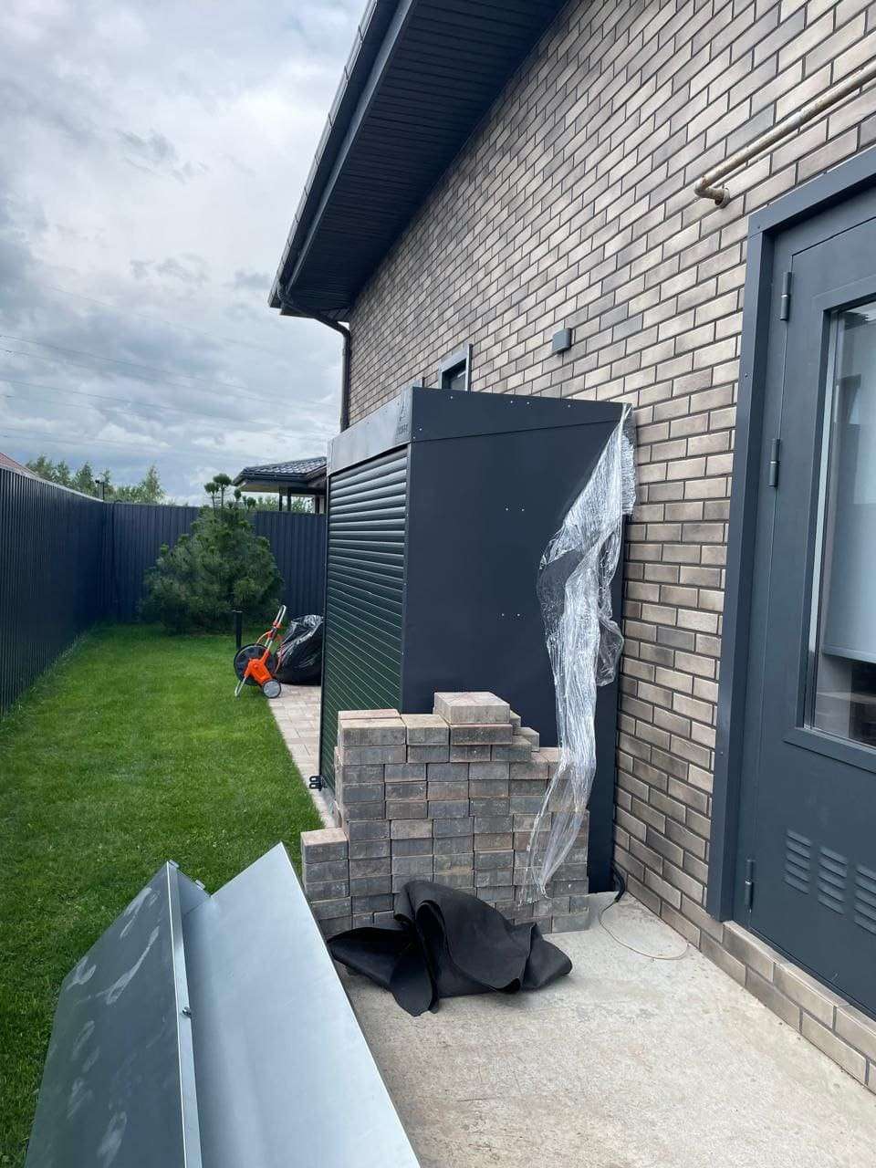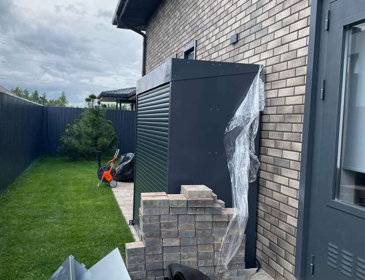 Нами была изготовлена конструкция размером 0,9 х 2,1 х 2,1 м с рольставнями в строгом графитовом цвете RAL 7024. Именно такой цвет был выбран, чтобы постройка гармонировала с цветом других деталей на участке.